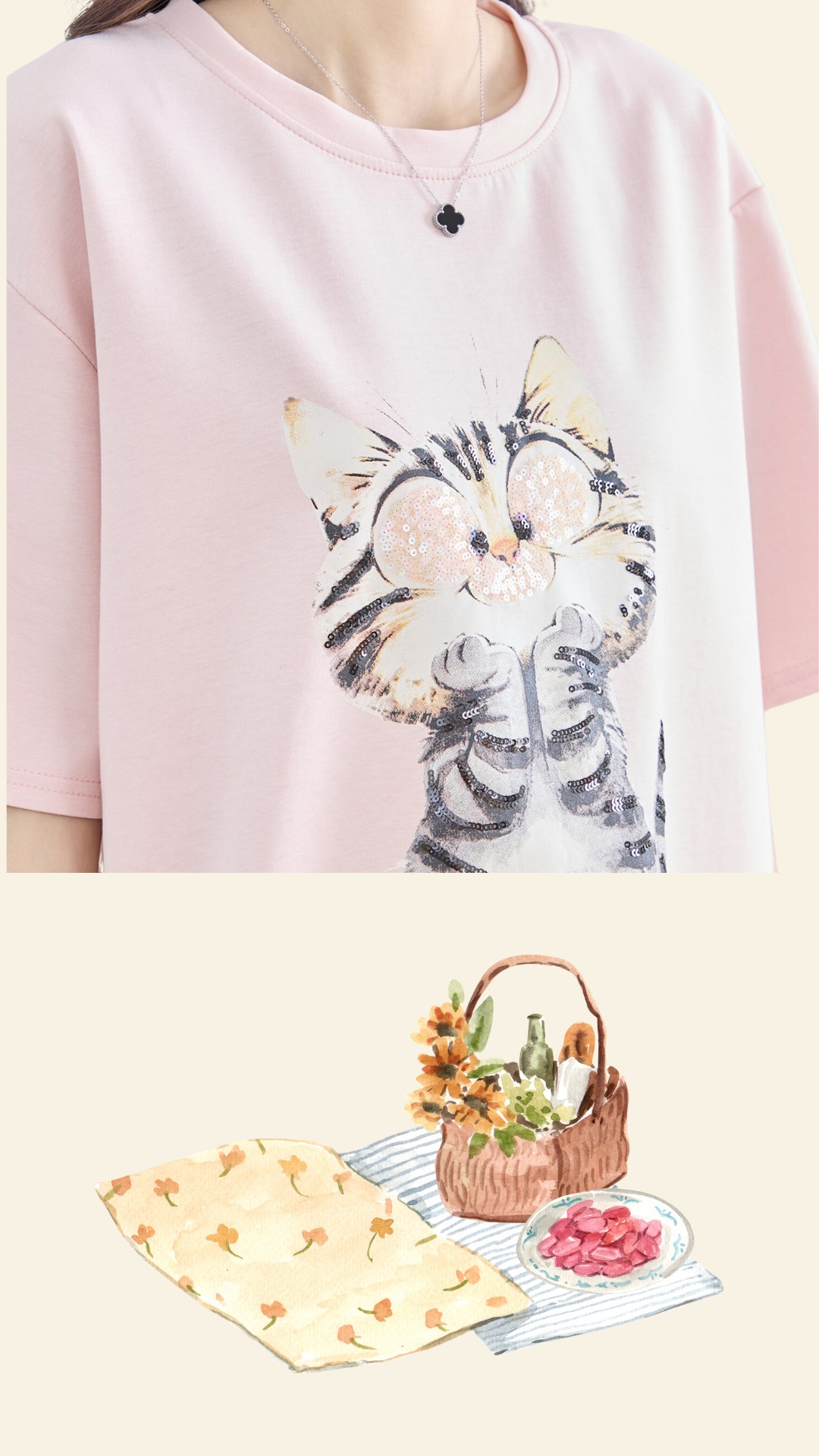 大きな瞳とちょこんとしたポーズが愛らしい、ネコちゃんプリントのTシャツ。