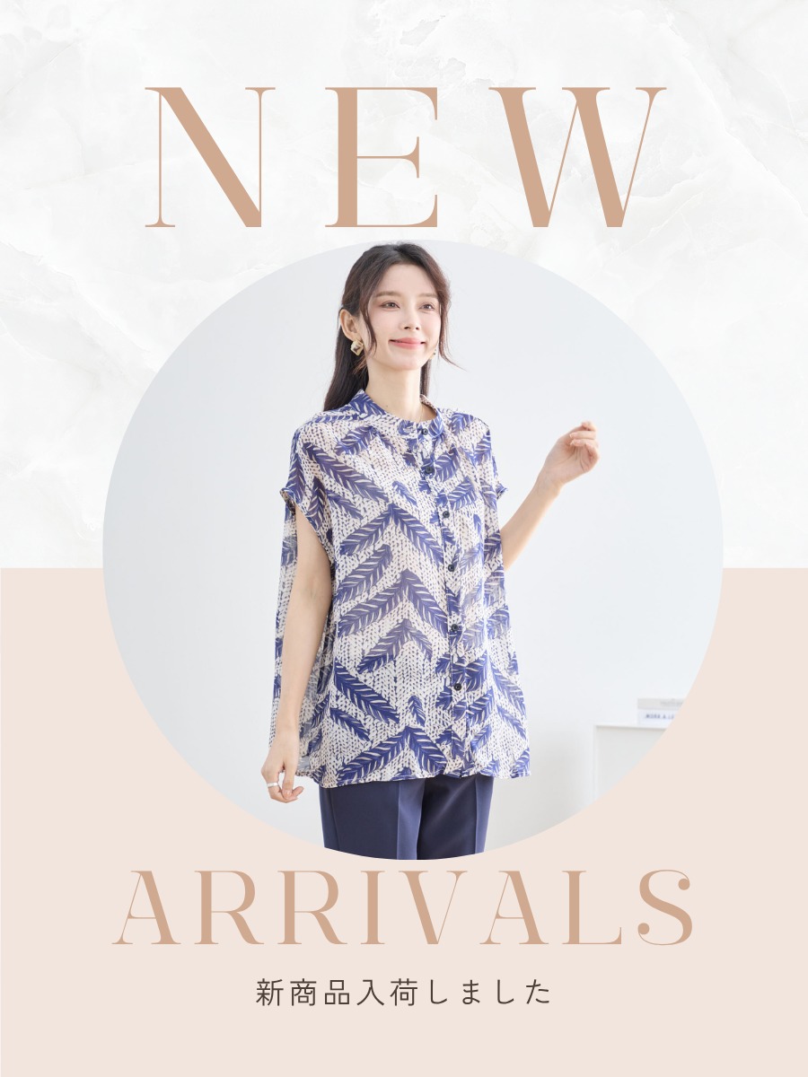 印象的なフェザー柄が目立つスタンドカラーシャツ。
