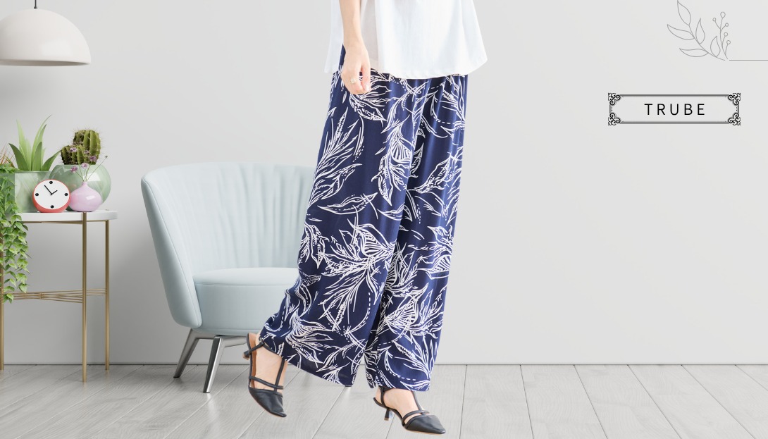 爽やかなネイビーベースに白のリーフ柄をあしらった、涼しげな印象のイージーパンツ。