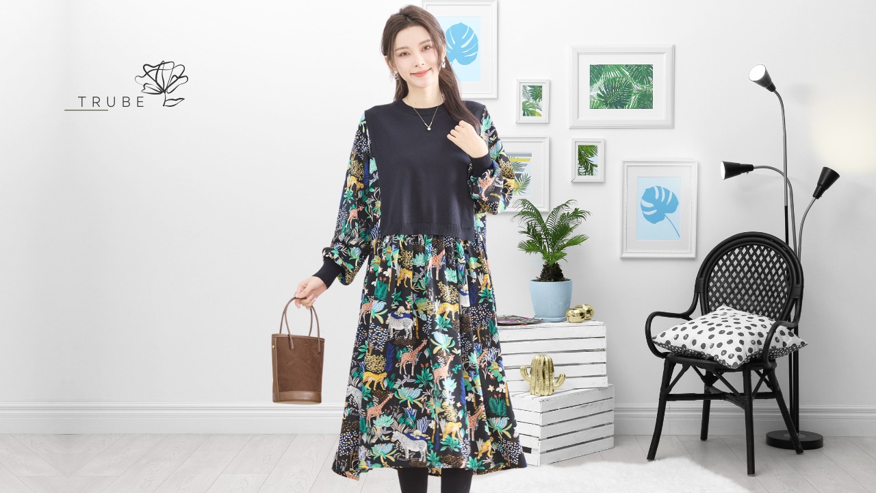 上部はシンプルなニット調素材、スカート部分はユニークなプリント柄で、