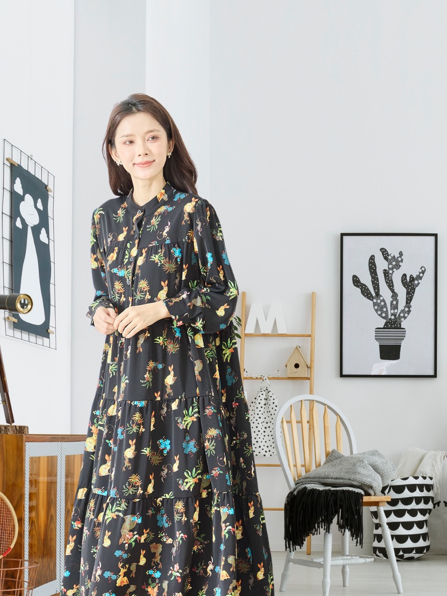 ノーカラーのティアードデザインが魅力的なアニマル&フラワープリントワンピースが登場!