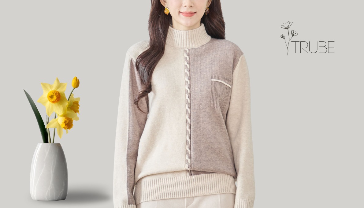 このプルオーバーは、配色切替のデザインとダミーポケットが特徴のセーターです。