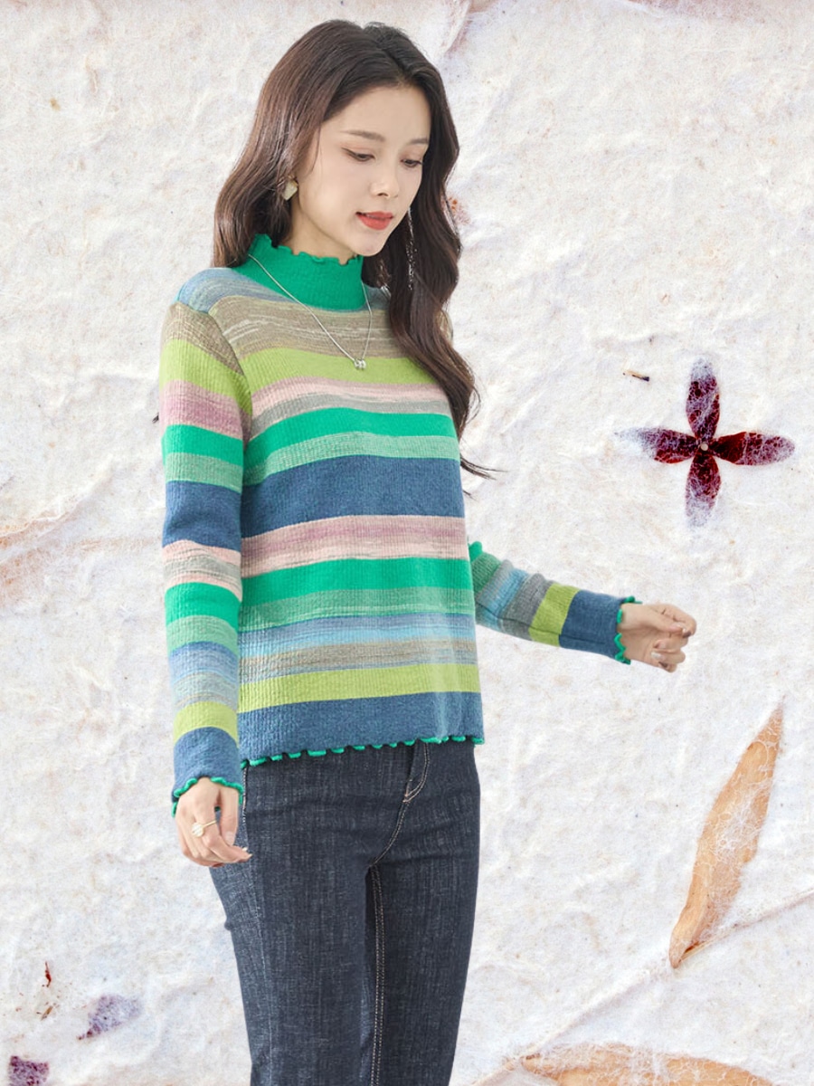 カラフルなボーダーデザインが目を引くマルチカラーボーダーニット。