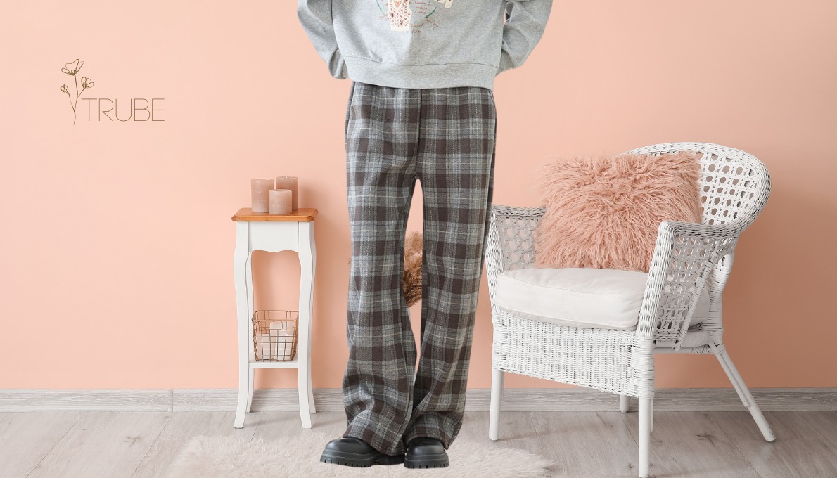 ウエストドロストデザインが特徴の裏起毛チェック柄パンツ。