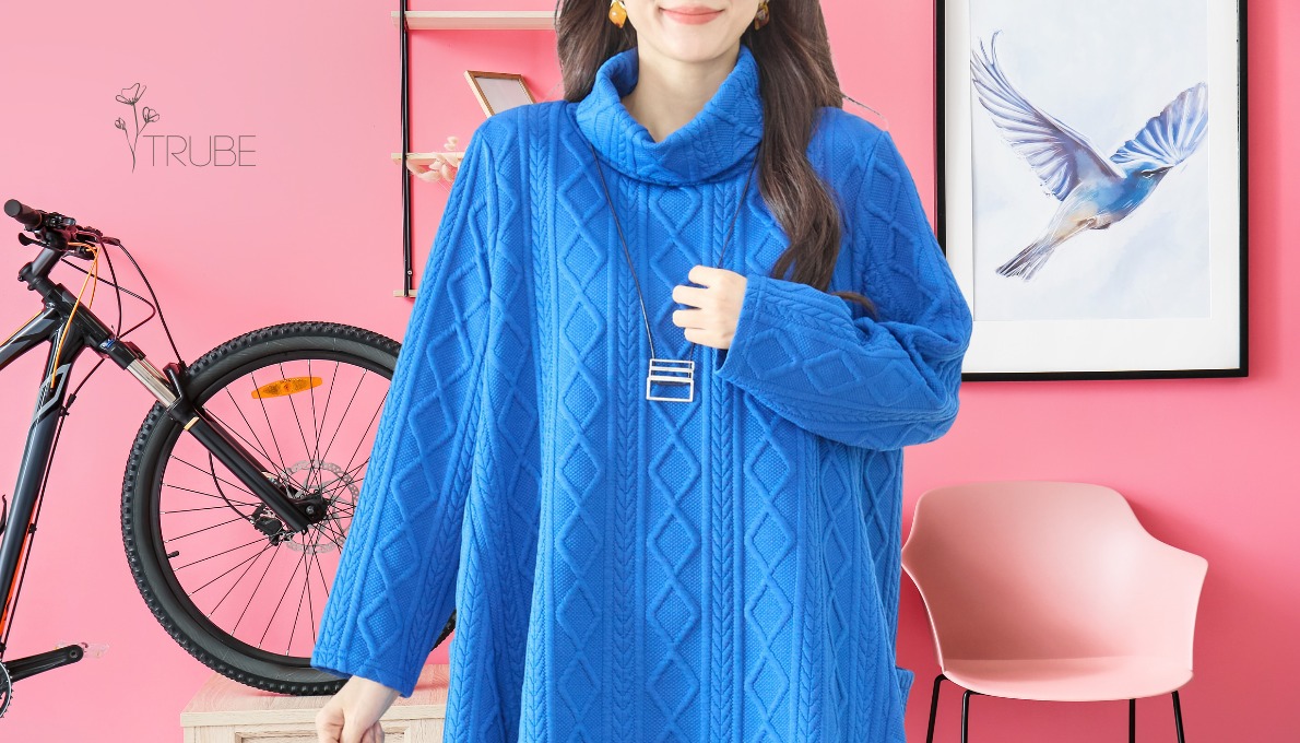 ケーブル編み風デザインのタートルネックチュニックワンピース。