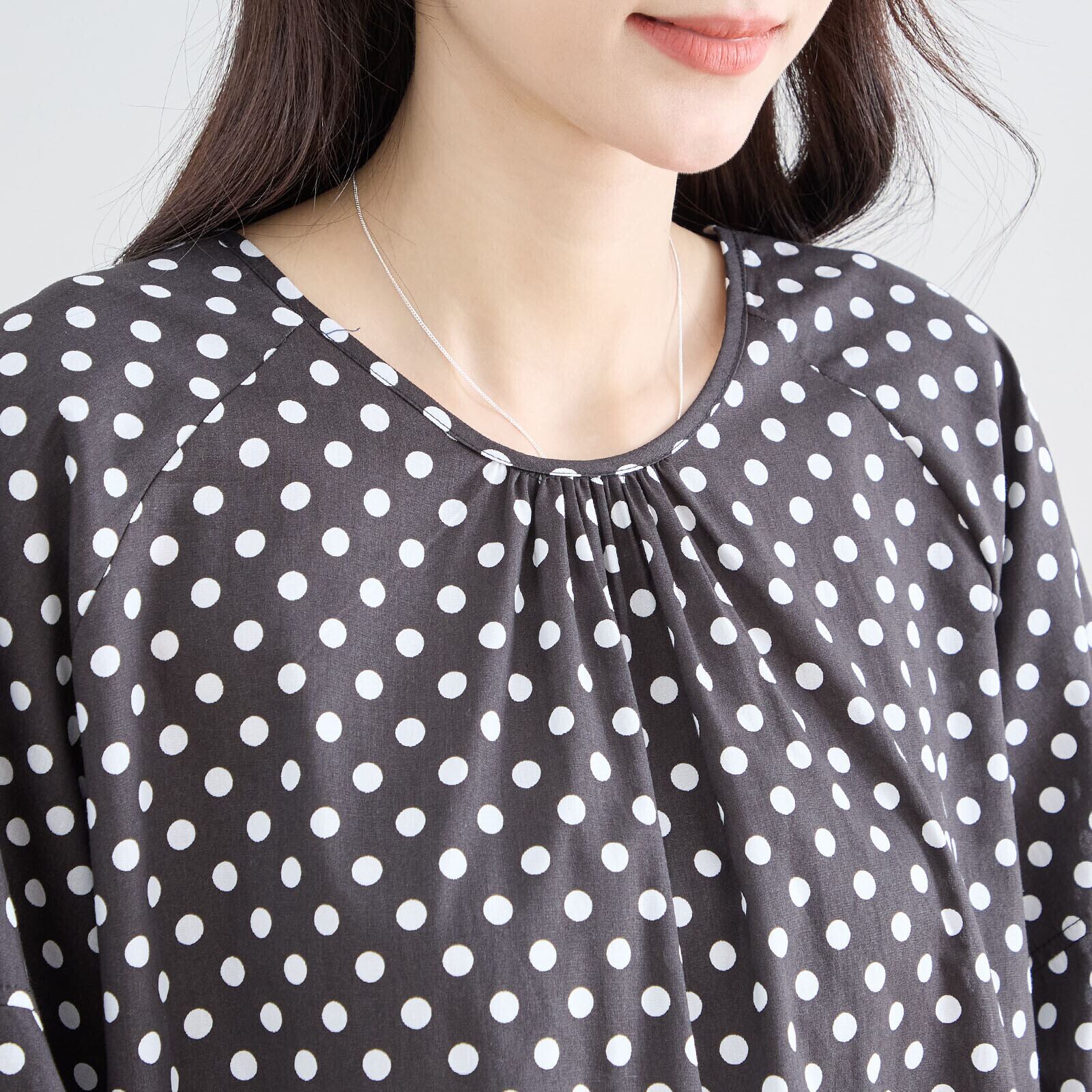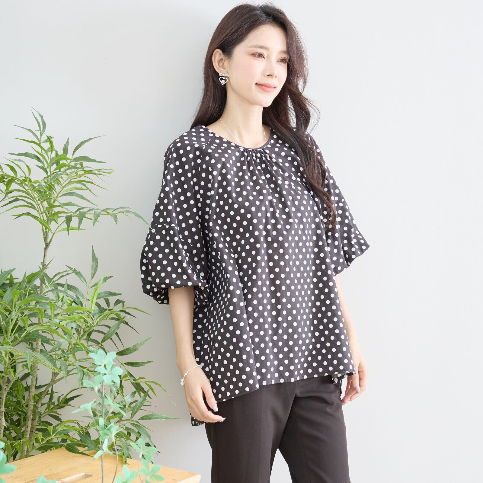 ふんわりとしたシルエットが魅力のドット柄ブラウス。
