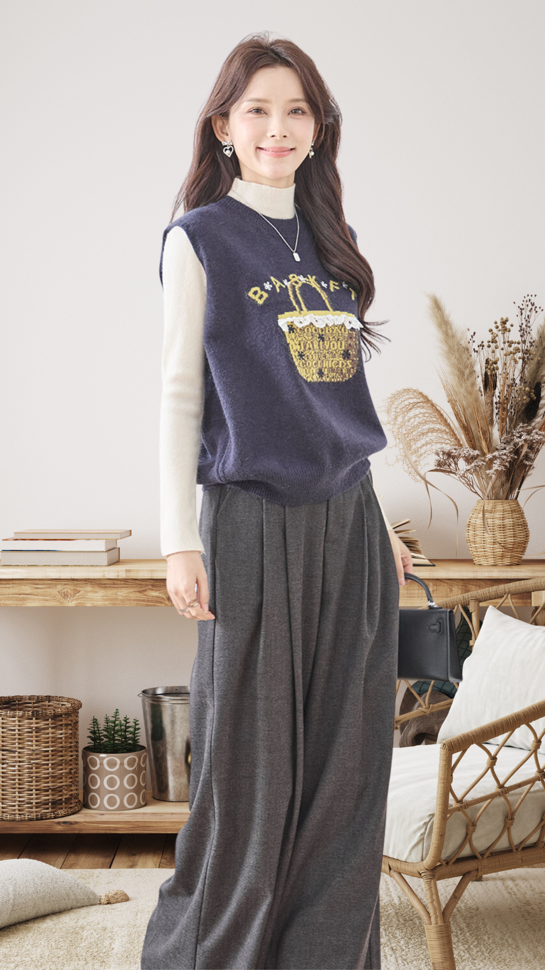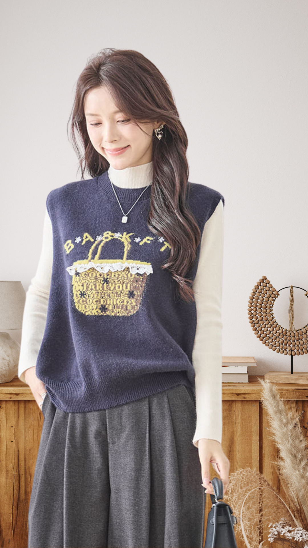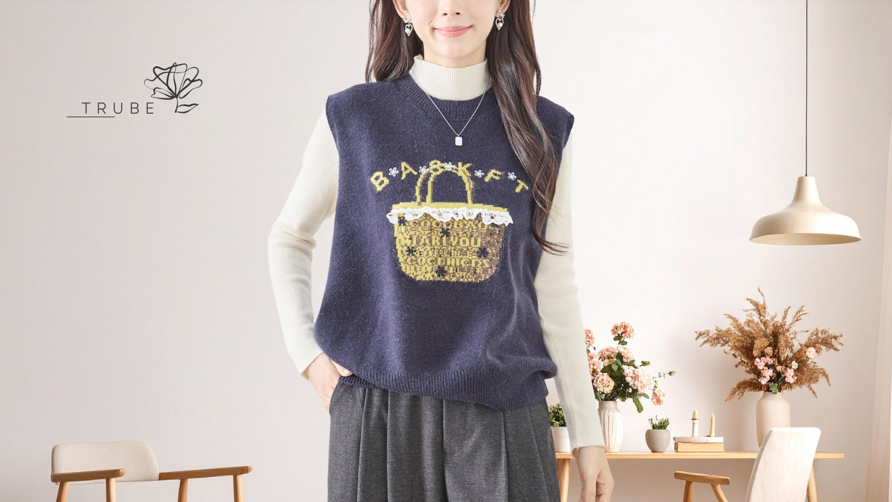 キーワード: #レディースファッション #レース付きトートバッグモチーフ #ニットベスト