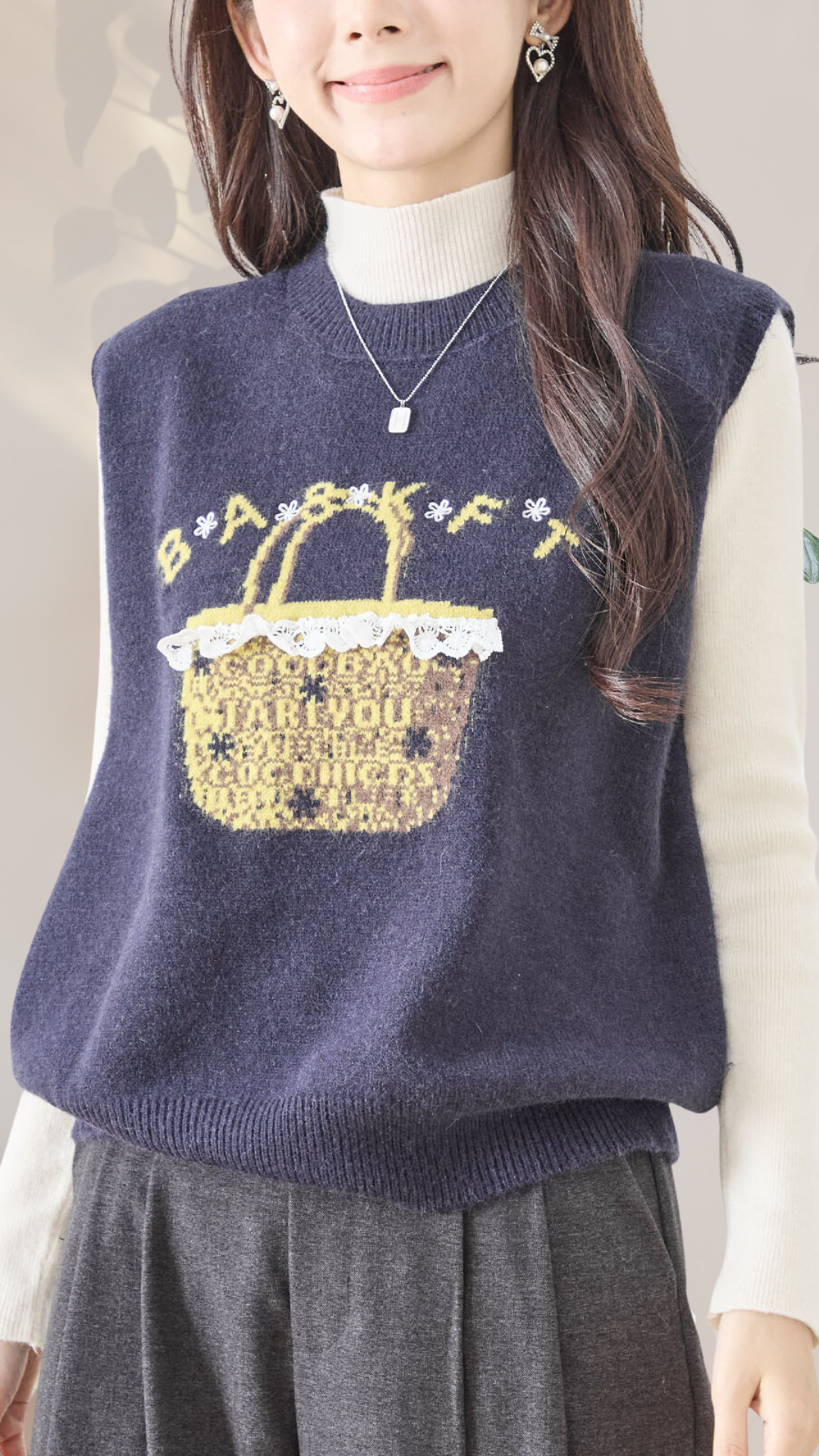 【SALE 16%OFF 12/28 10:00まで】ベスト レース付きトートバッグモチーフ ニットベスト ネイビー 2025新作【M〜L】