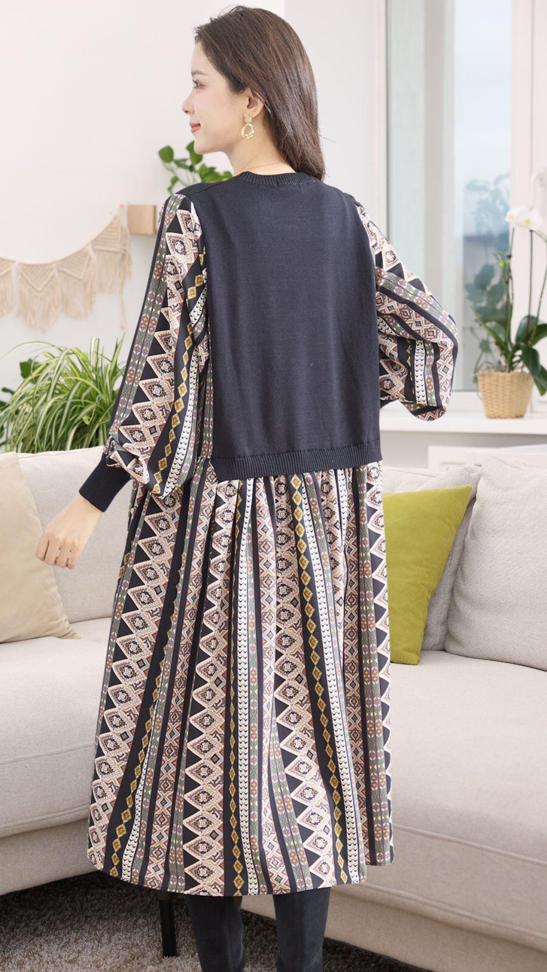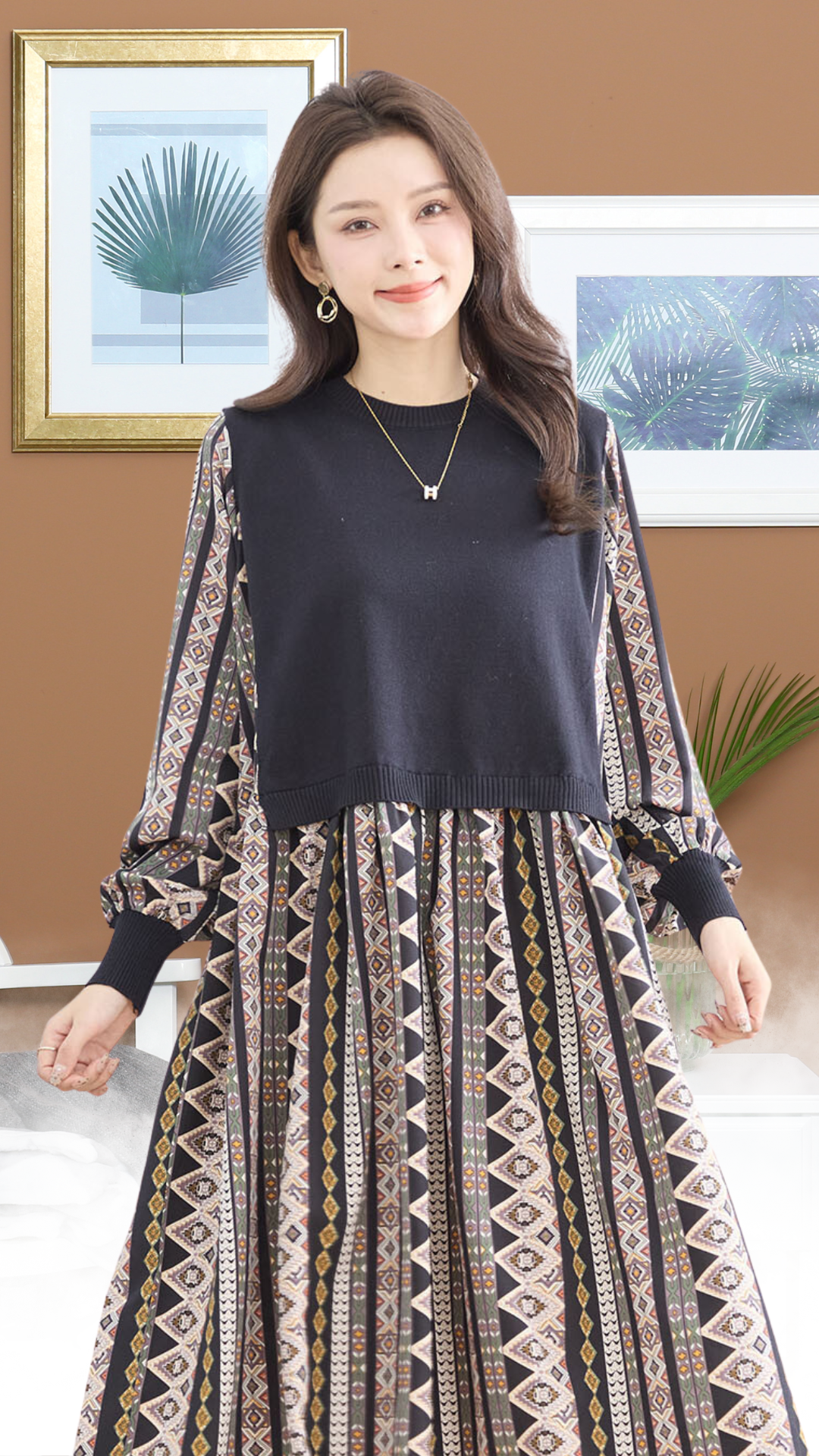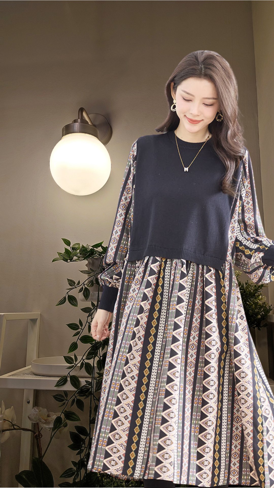・商品名 : 異素材ドッキング ジオメトリック柄ワンピース