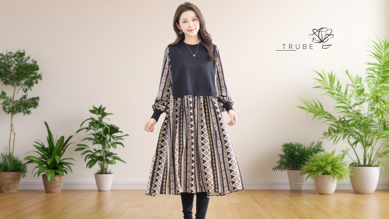 ワンピース 異素材ドッキング ジオメトリック柄ワンピース TRUBE【L〜LL】