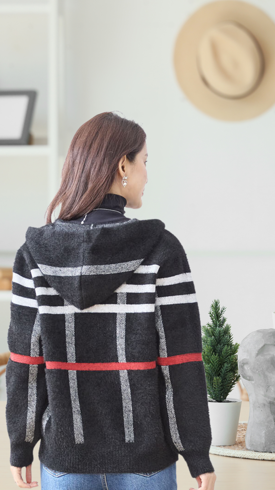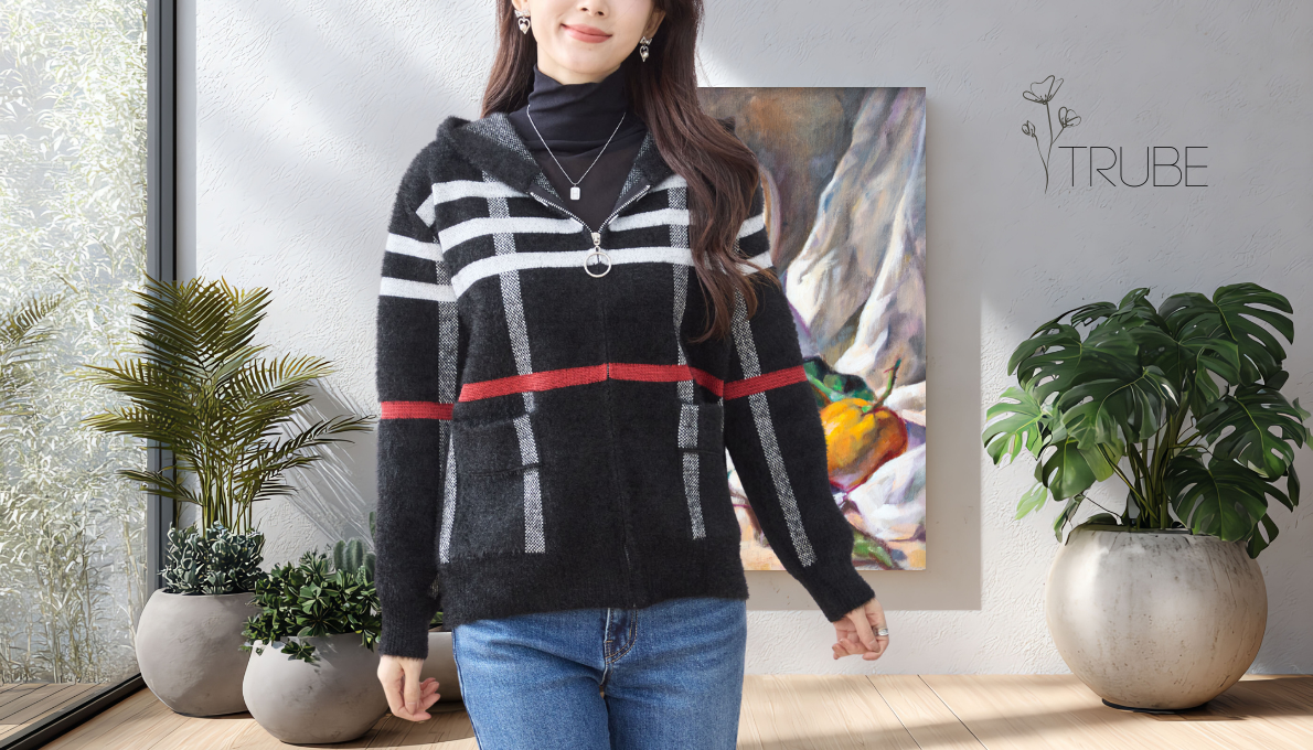 【SALE 6%OFF 12/22 10:00まで】ジャケット チェック柄フードデザインシャギーニットジャケット ブラック【M~L】TRUBE 2025新作