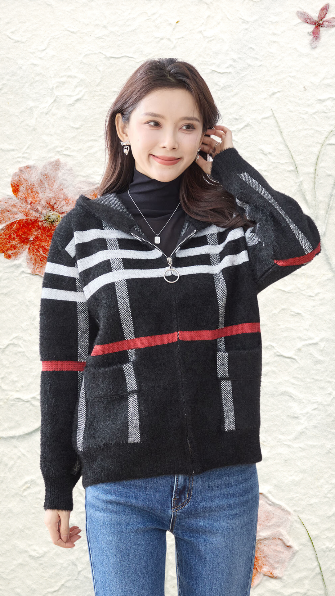 キーワード:#チェック柄 #シャギーニット #フード付きジップアップジャケット