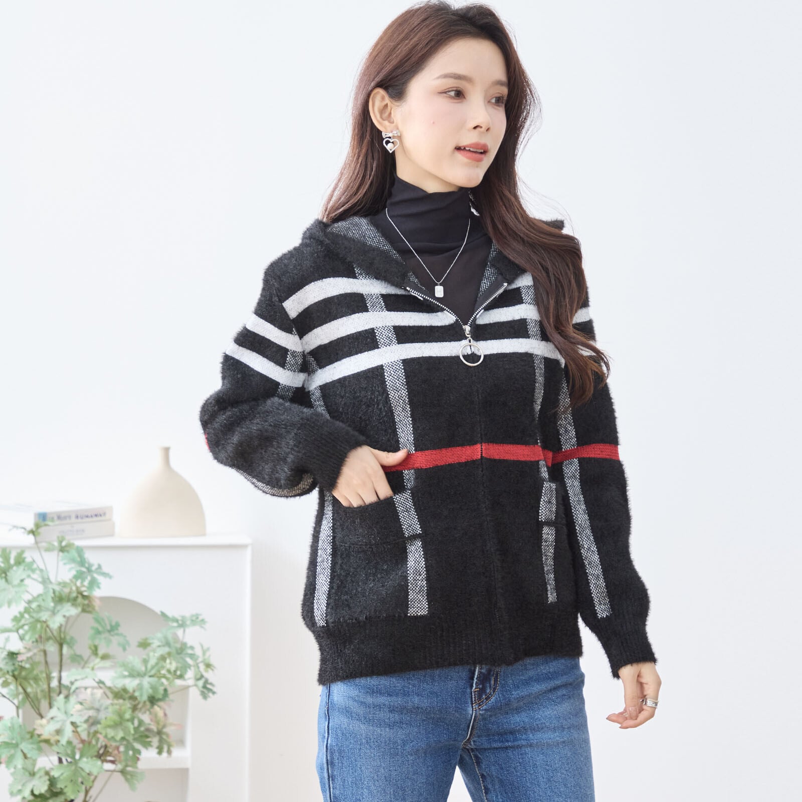 ・商品名 : チェック柄フードデザインシャギーニットジャケット
