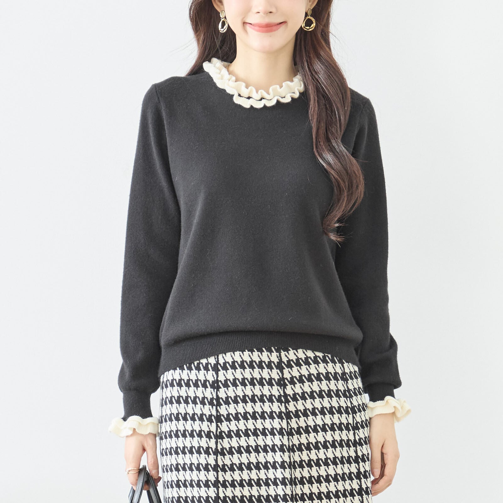 ネックと袖口のアイボリー配色がアクセントのリブメロウフリルニットトップス。
