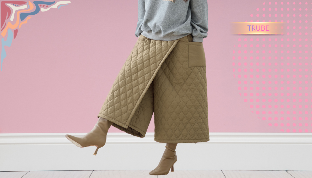 キルティングデザインが魅力的な巻スカート風ワイドパンツ。