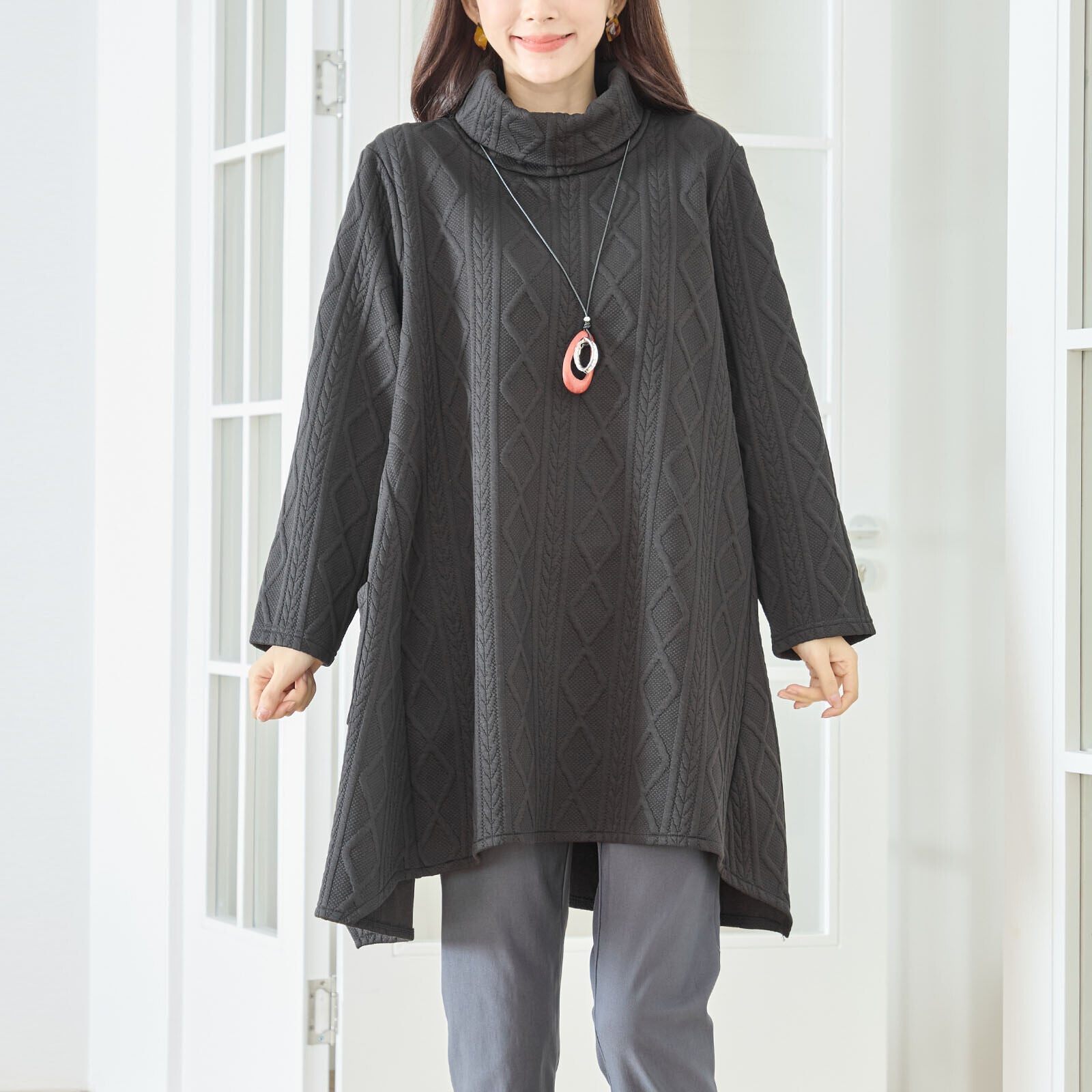 ケーブル編み風デザインのタートルネックチュニックワンピース。
