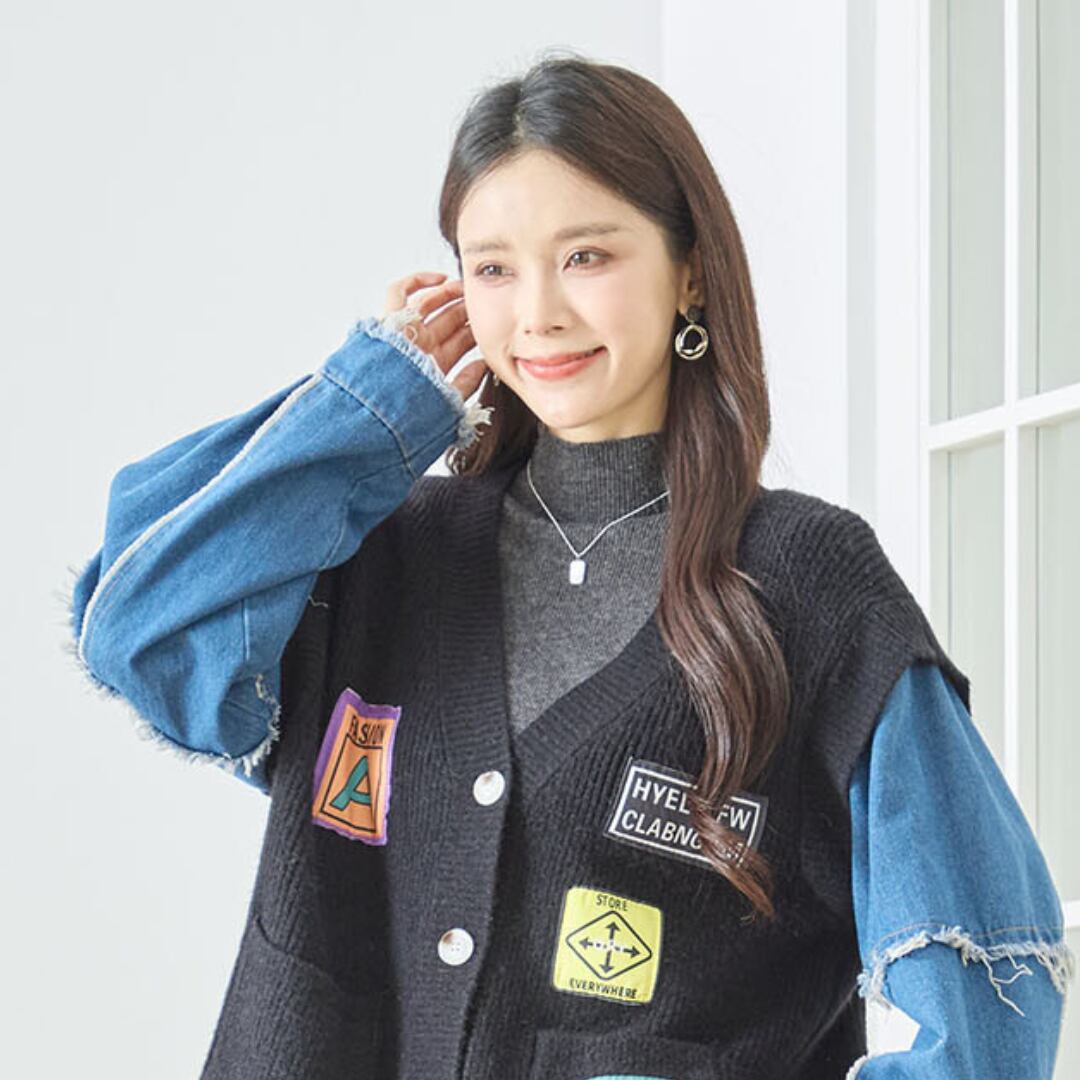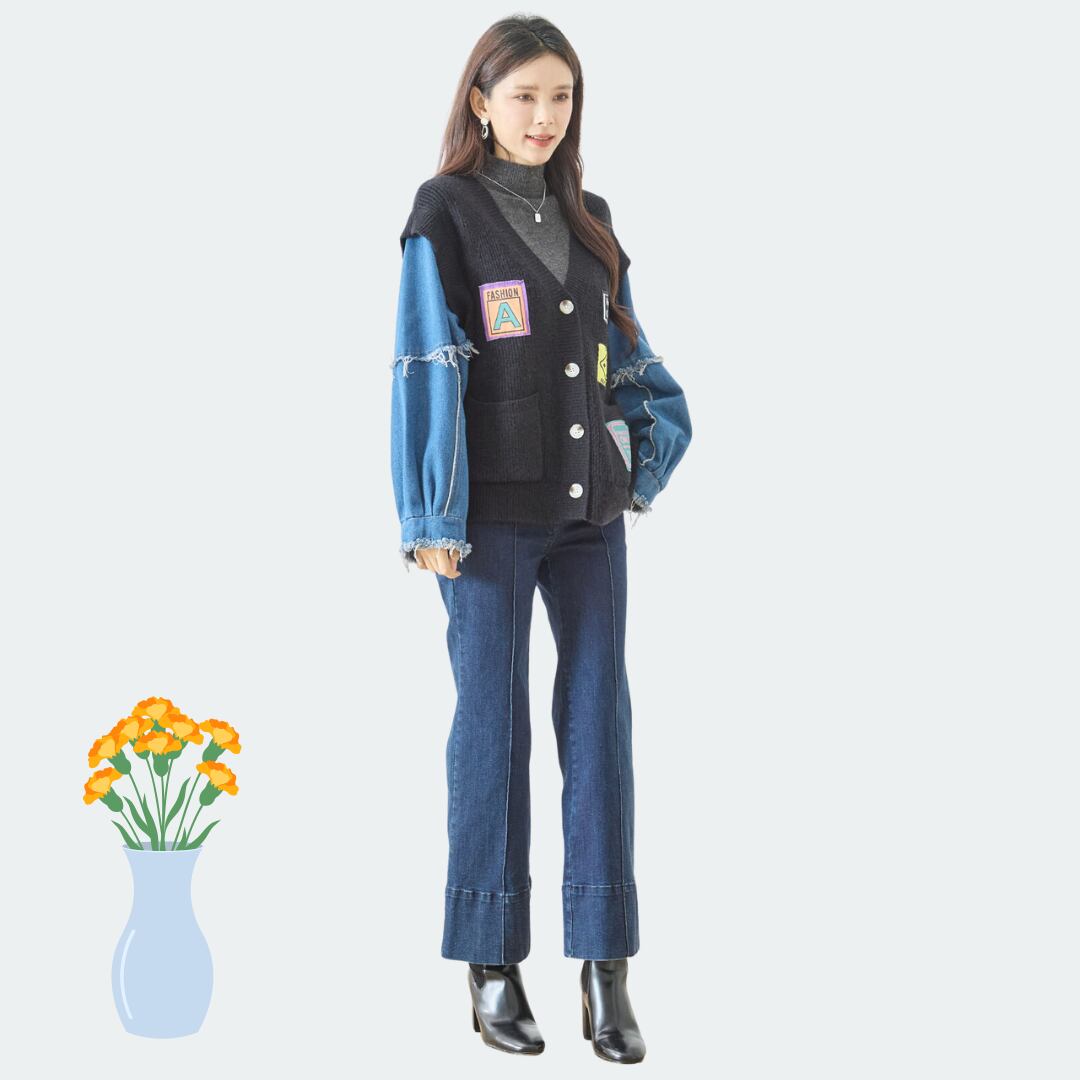 キーワード:#デニム袖 #リブニットカーディガン #ワッペンデザイン