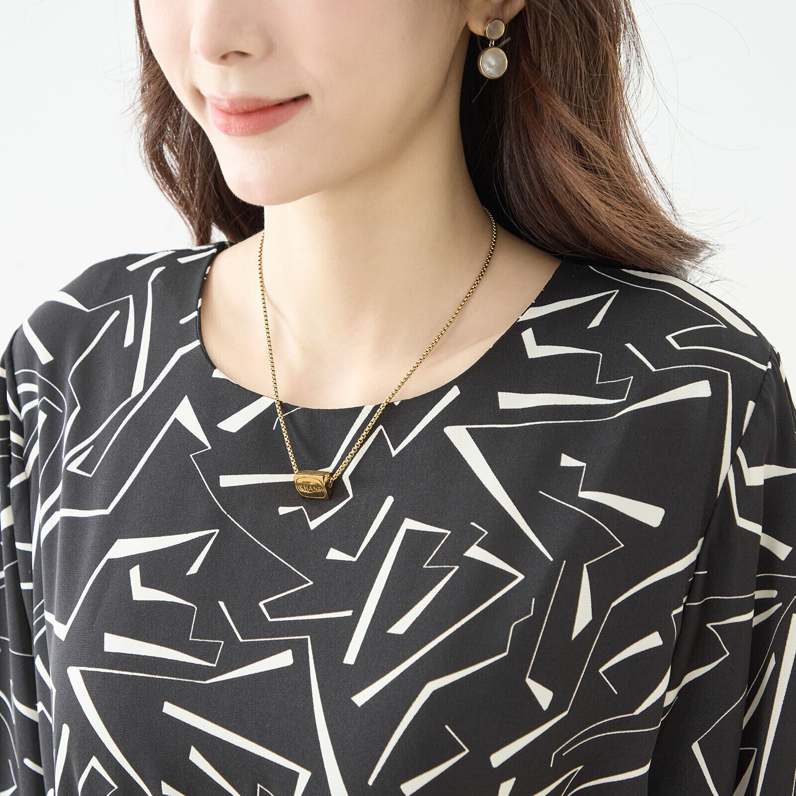 TRUBE モノトーン幾何学模様プリーツワンピース【L~LL】ブラック