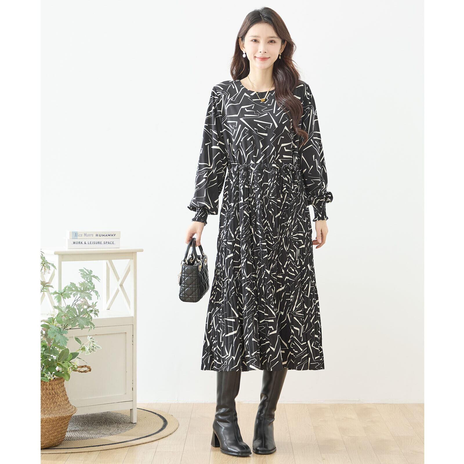 ・商品名 : モノトーン幾何学模様 ウエストドロスト プリーツワンピース