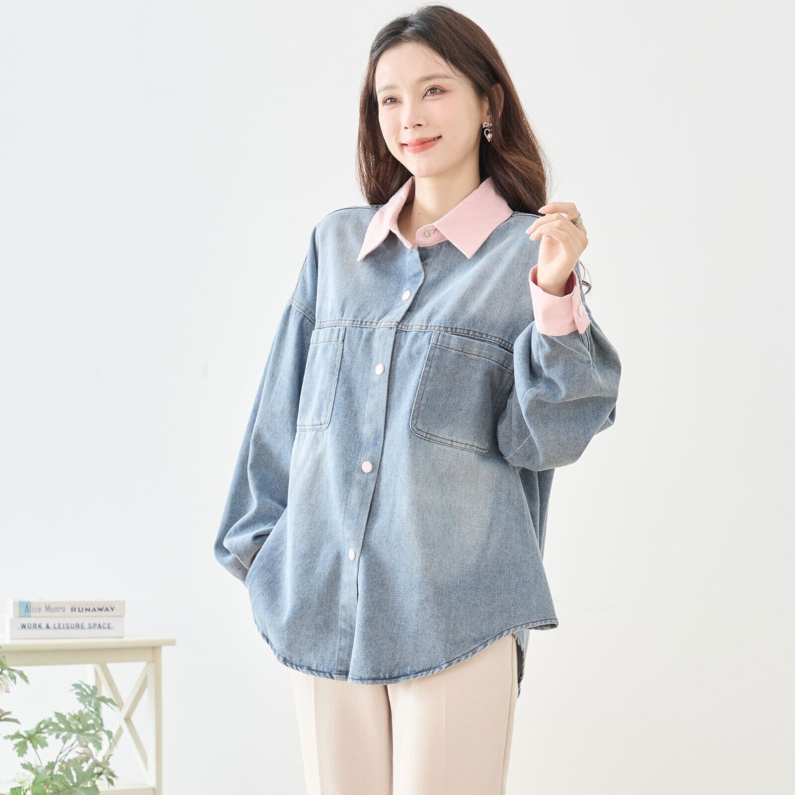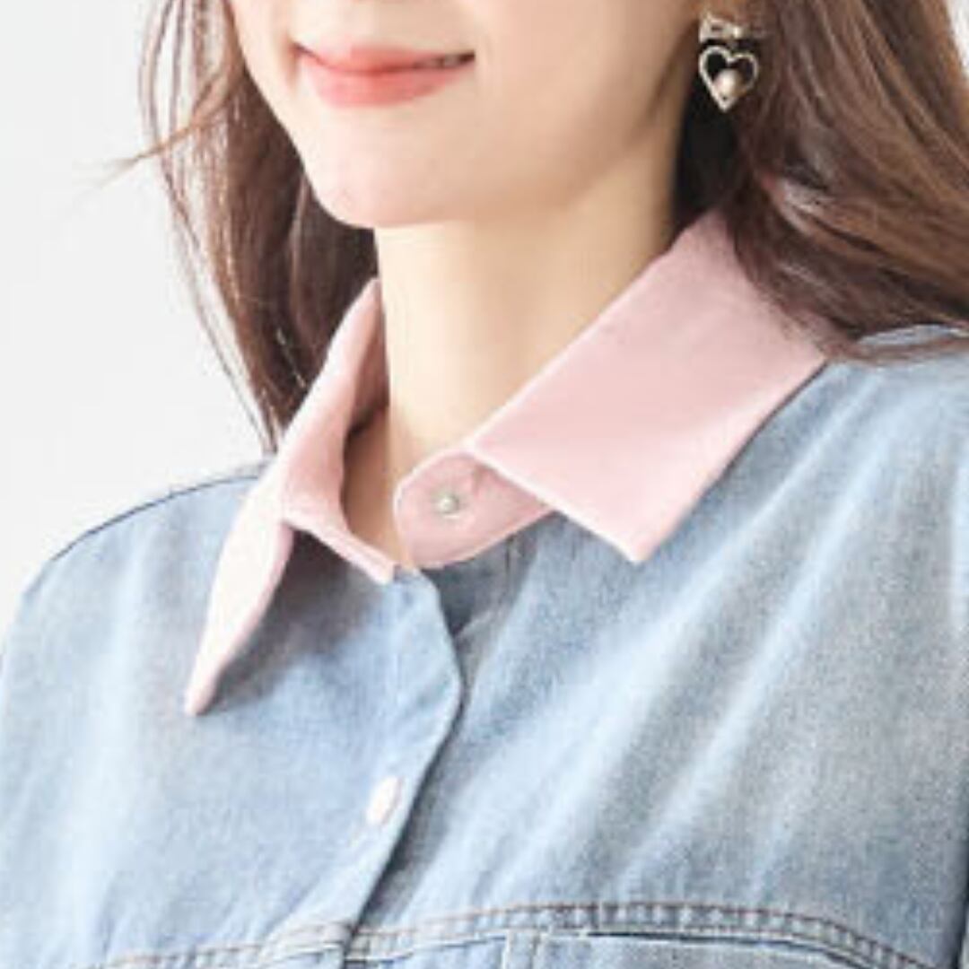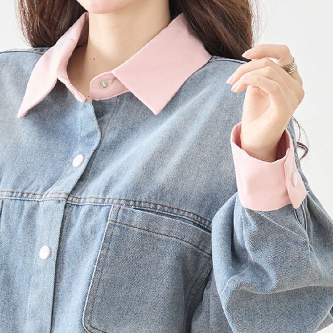 デニムブルーの本体に、ピンクの衿、袖口、釦が加わり、カジュアルながらも個性的な印象を与えます。