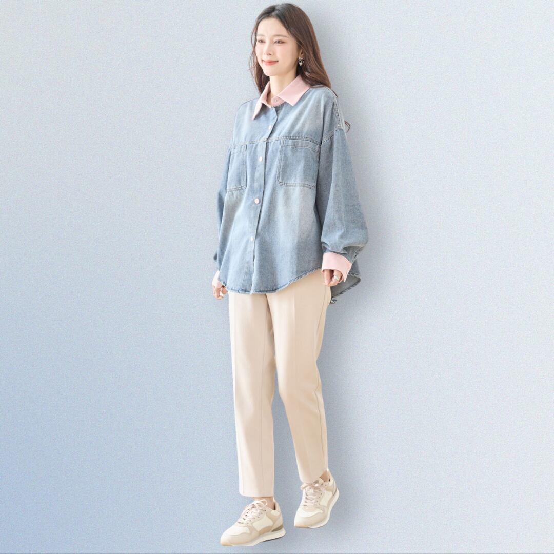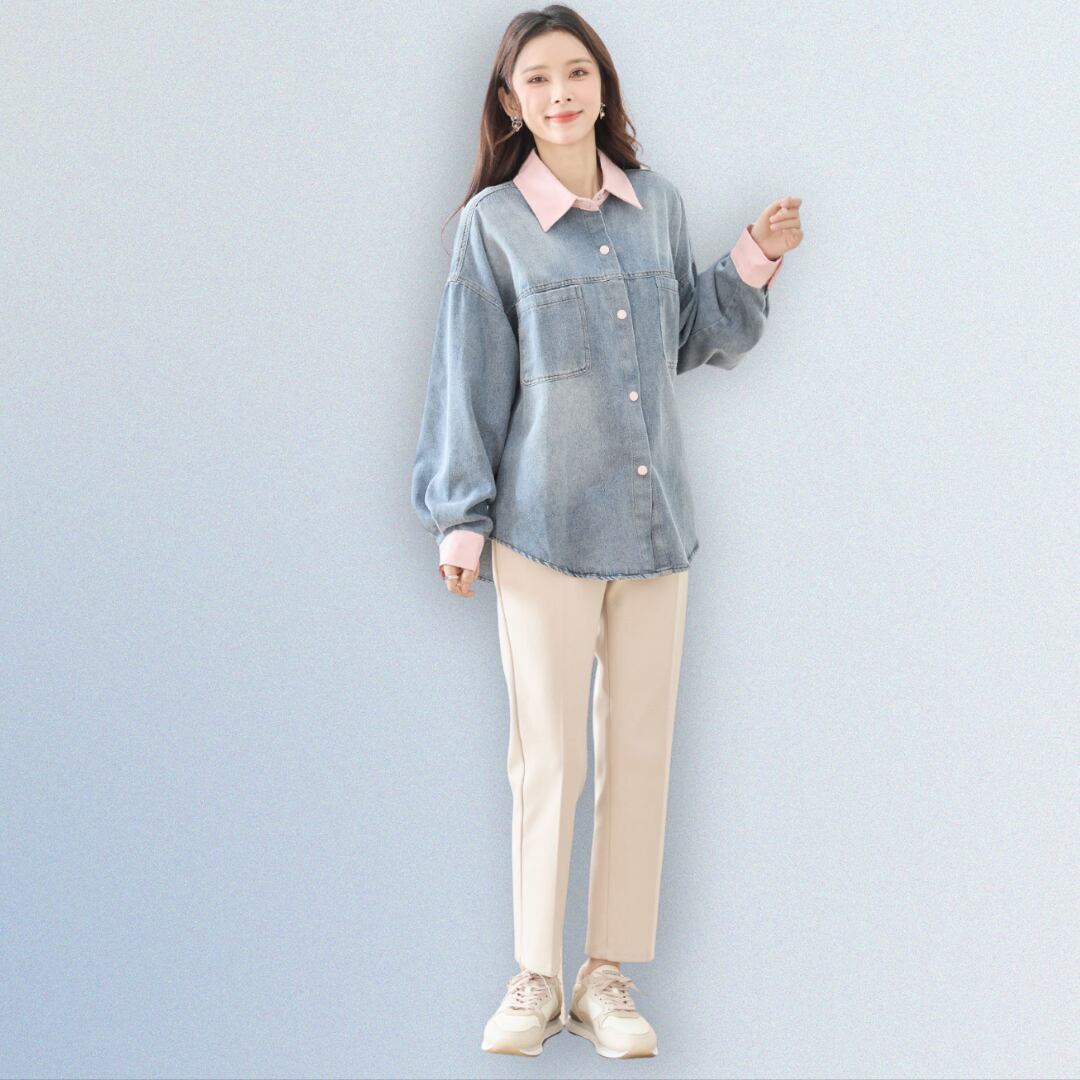 可愛らしい配色アクセントが際立つ長袖デニムシャツ!