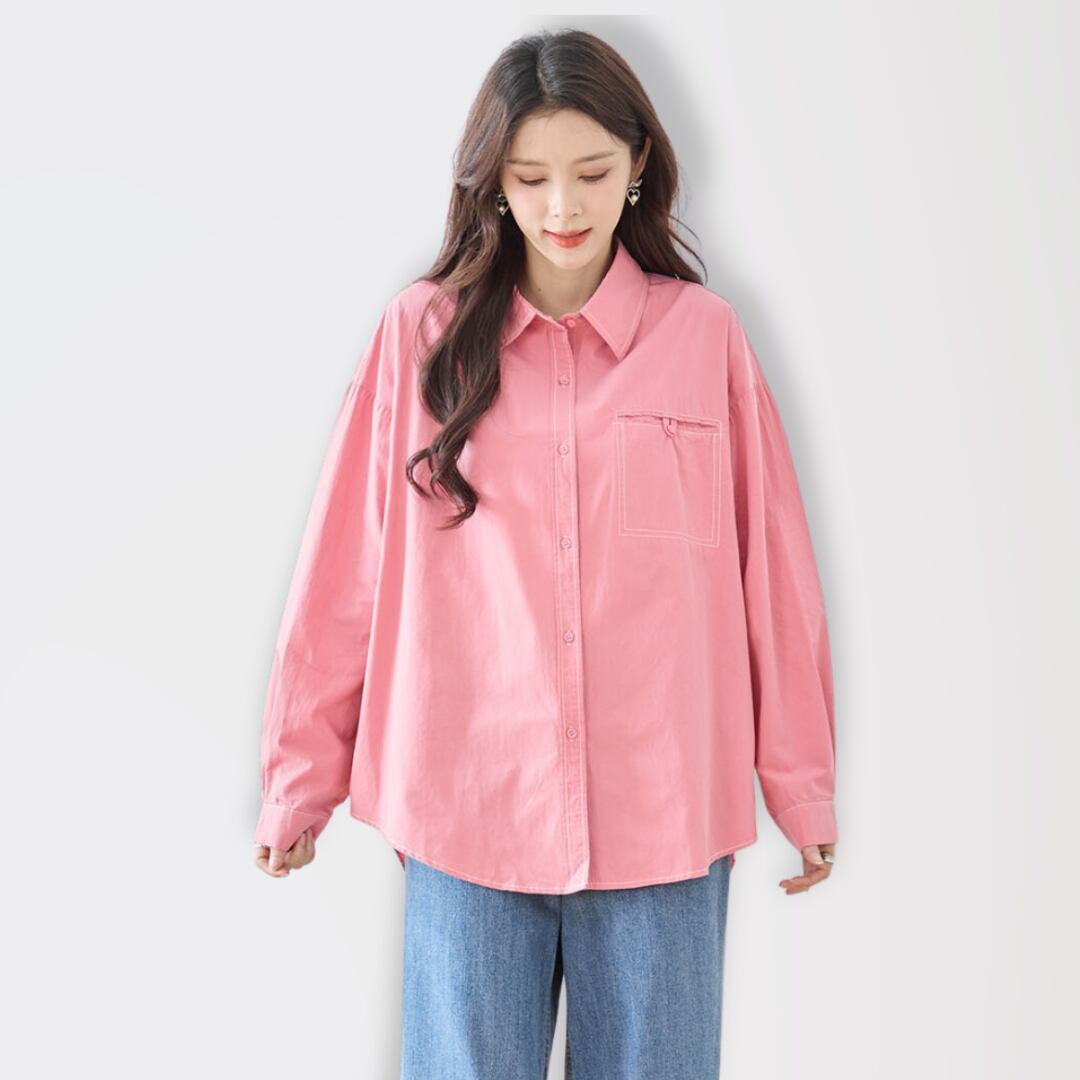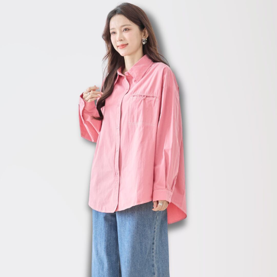 キュートなピンクが目を引くカジュアル胸ポケット付きカラーシャツ!