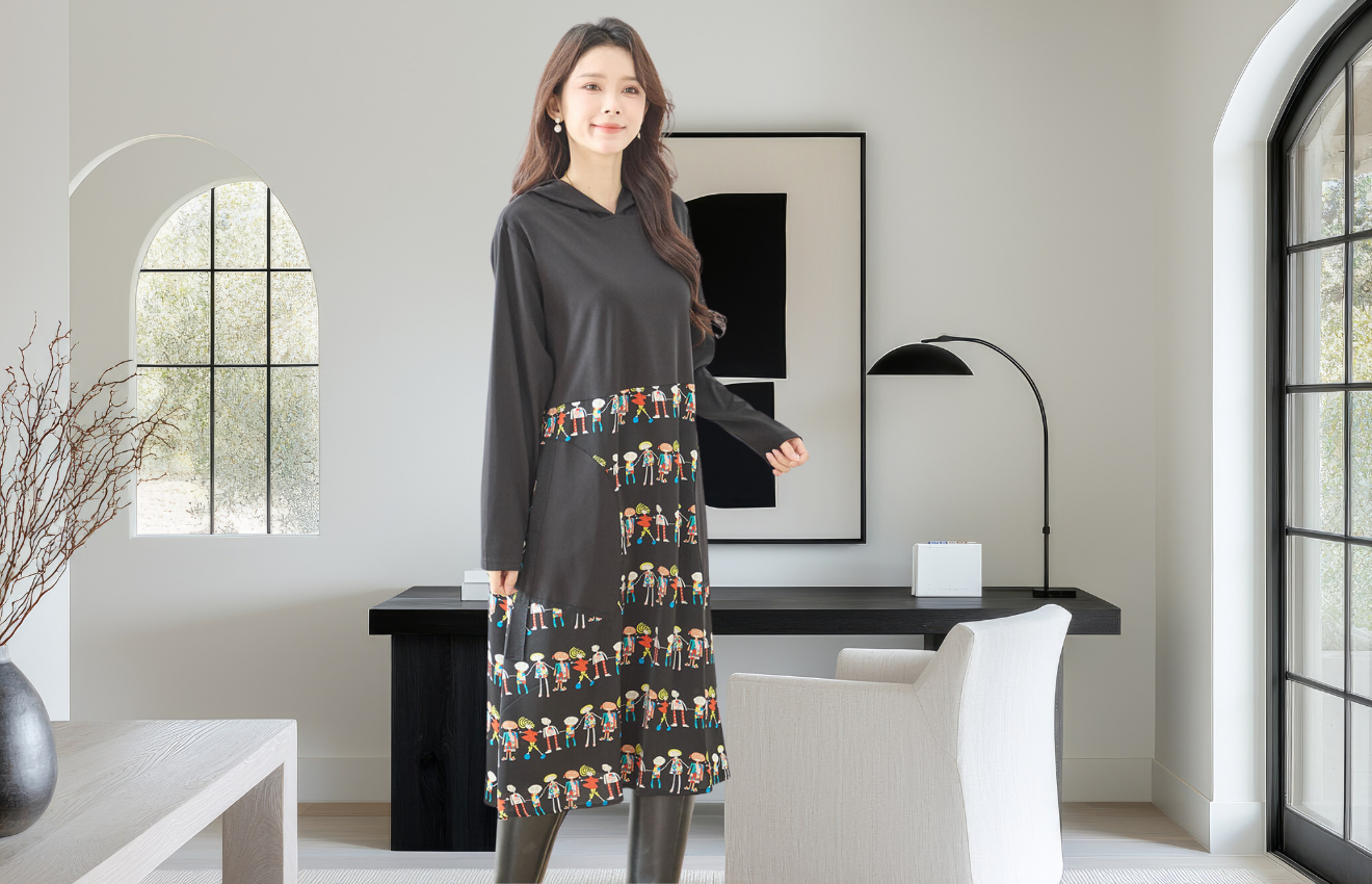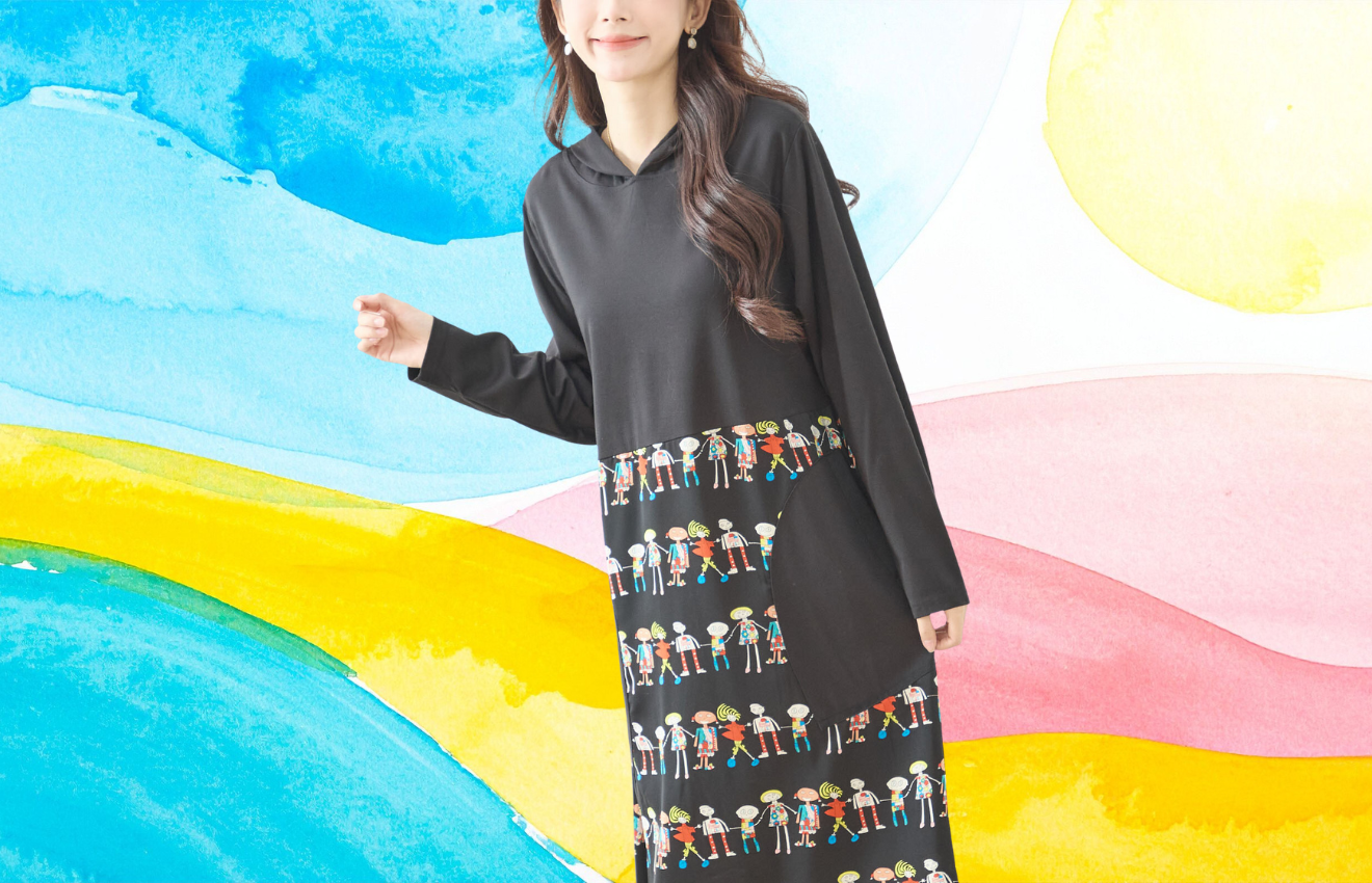 ユニークなフィギュア柄が映えるフーディーワンピース!