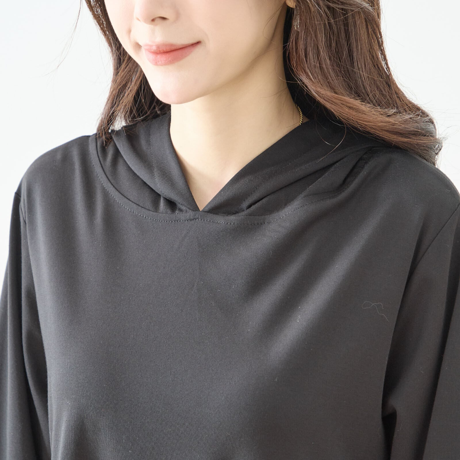 フード付きという機能的なデザインが印象的です。軽やかで通気性の良い素材が、快適な着心地を提供し、季節を問わず気軽に楽しめるワンピースです。
