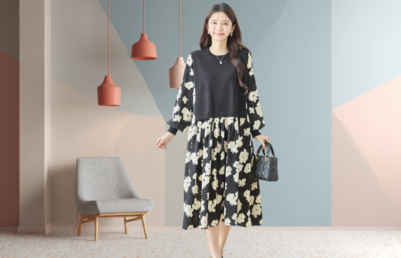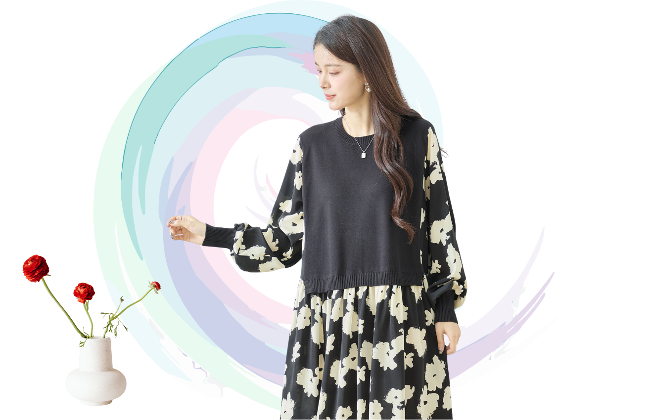 トップ部分はニットベスト風、ボトム部分は上品なプリント柄の組み合わせで、