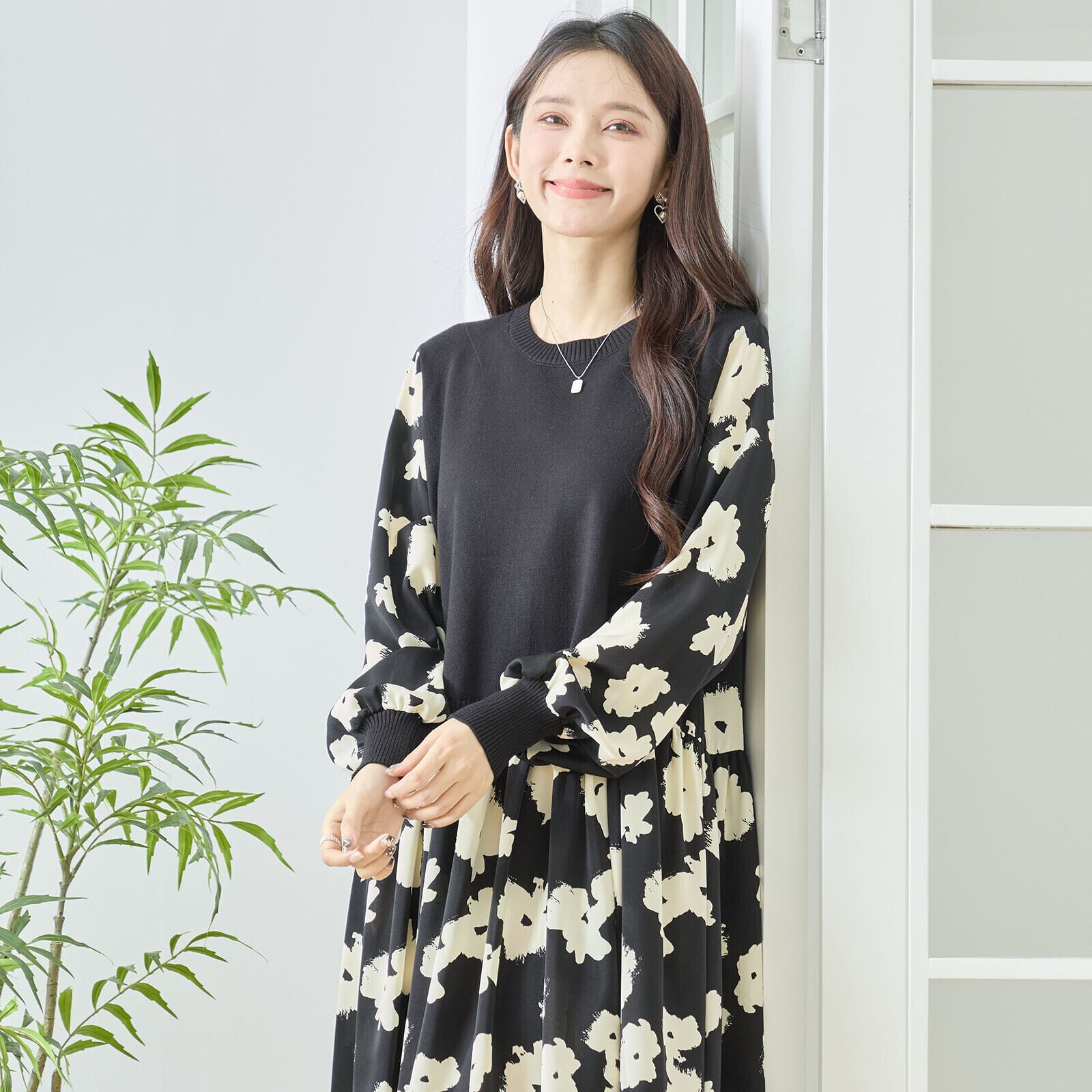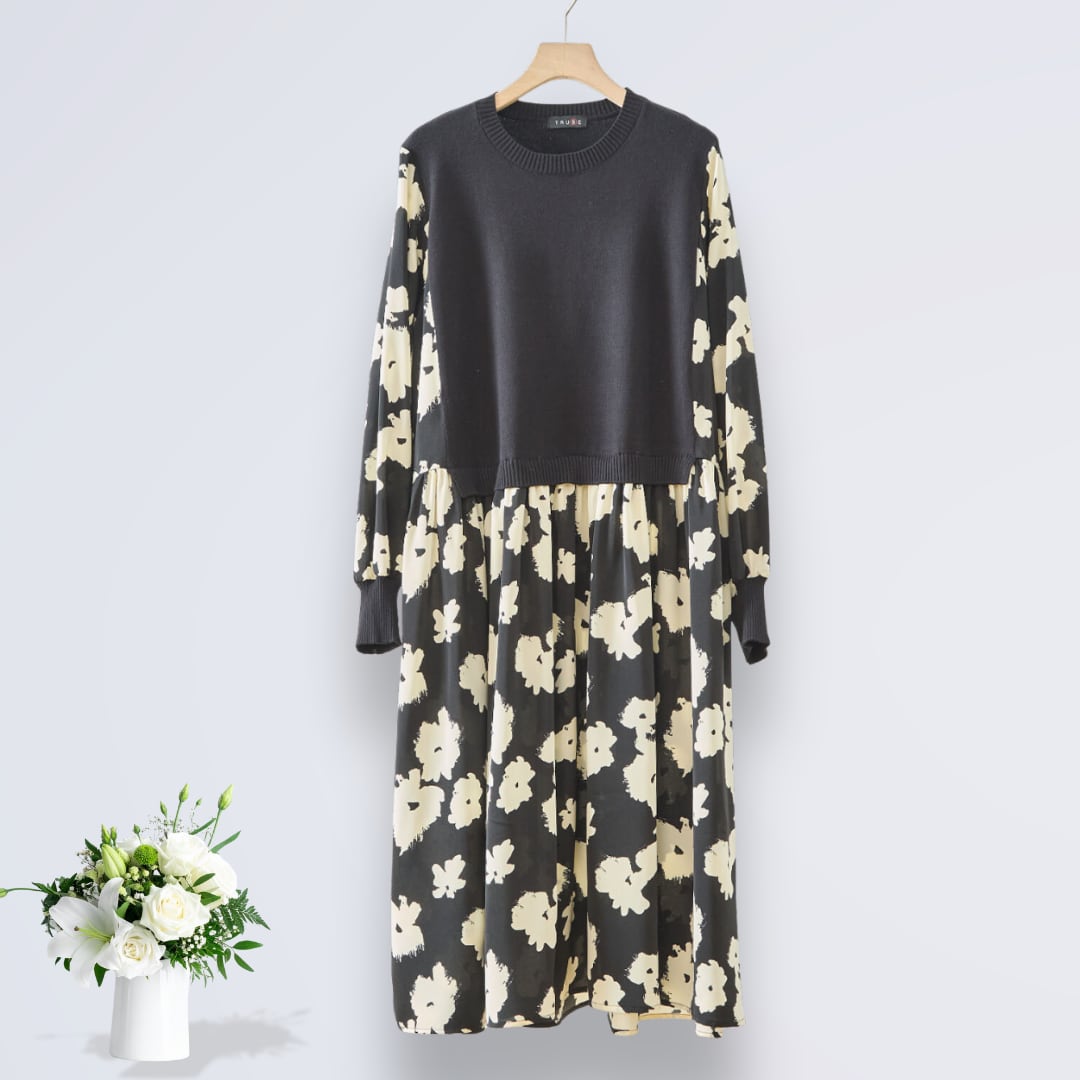 TRUBE ニットドッキングフラワープリントワンピース【M~L】ブラック