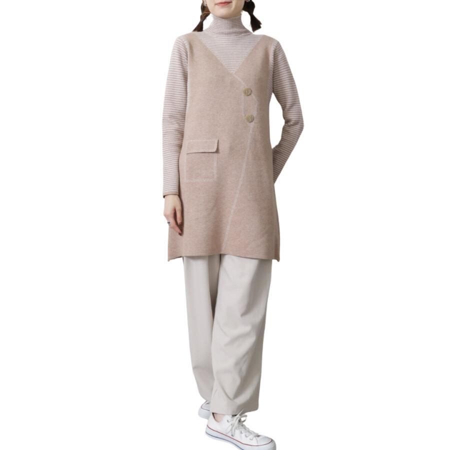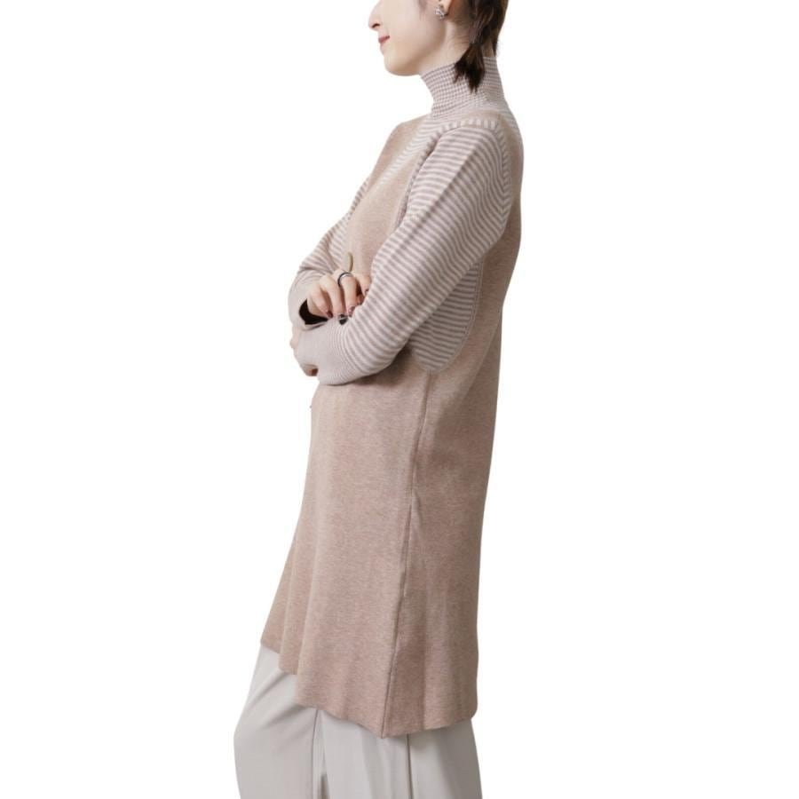 レイヤード風デザインが洗練された印象を与えるニットストライプ切替ボタン付きチュニックです。