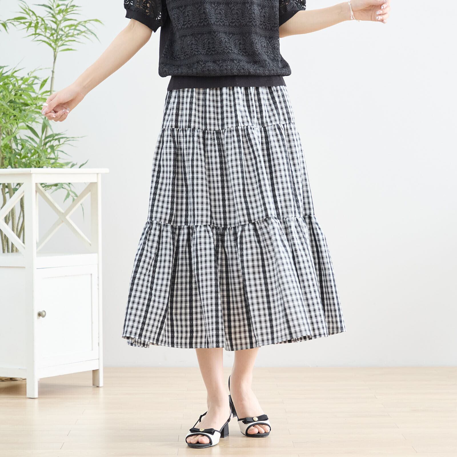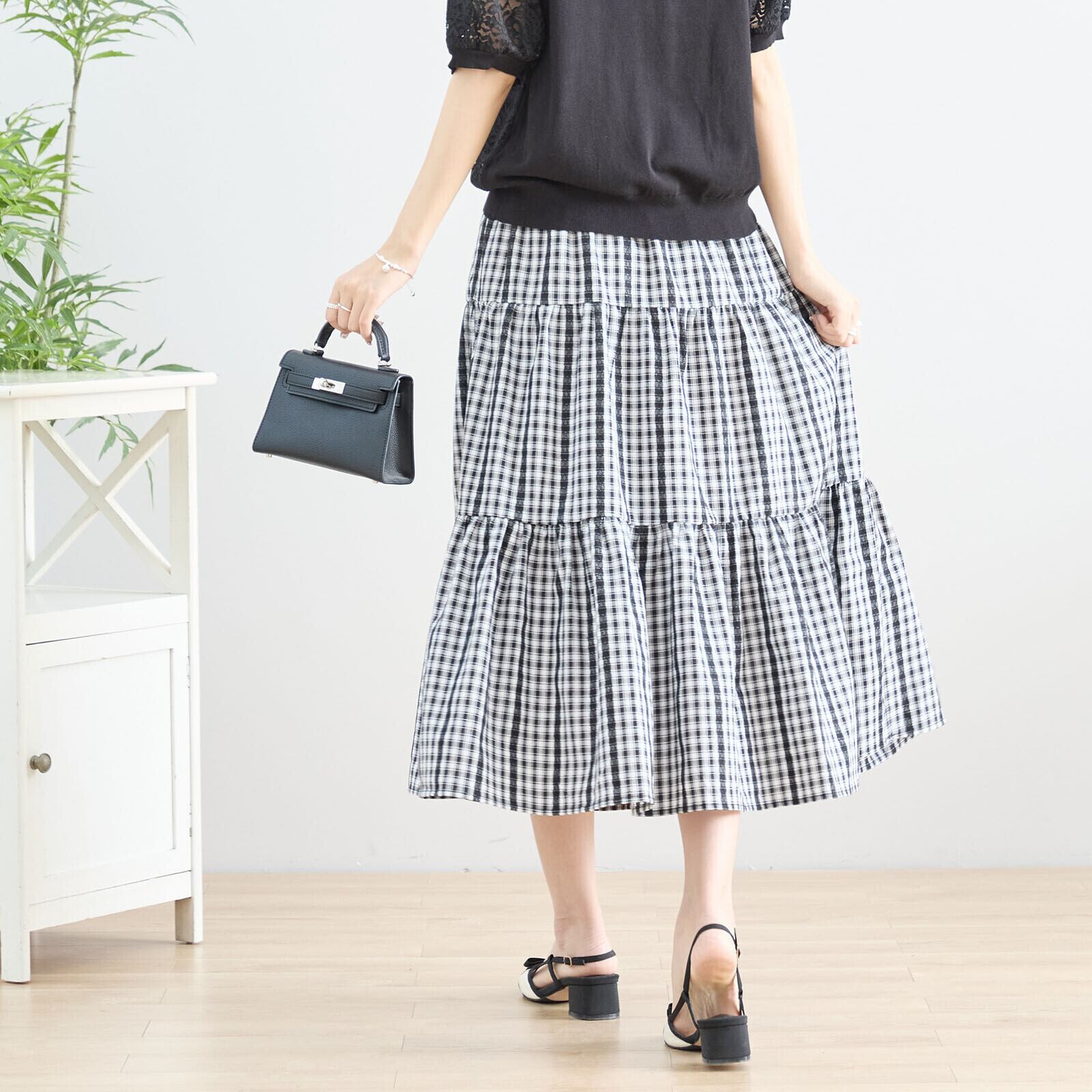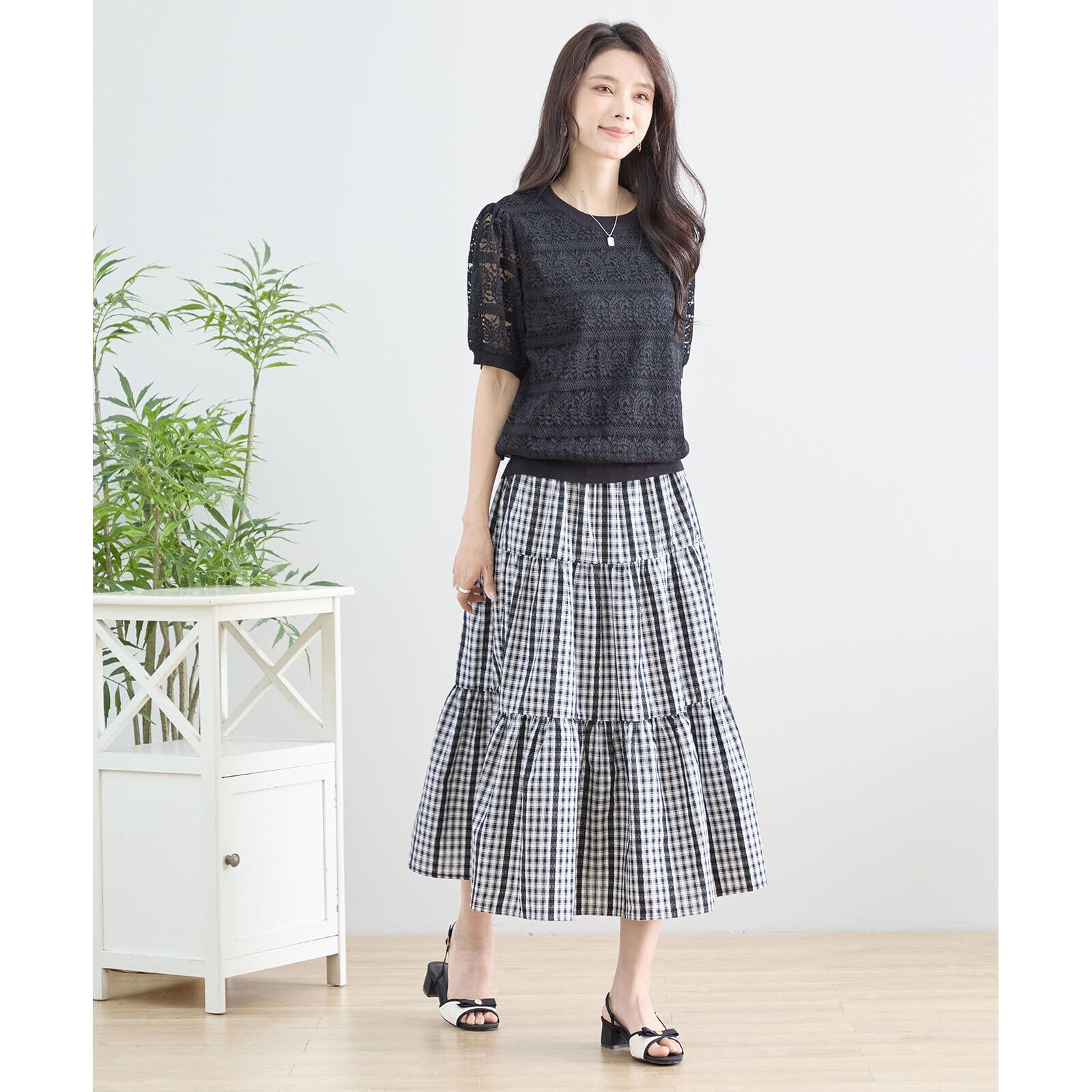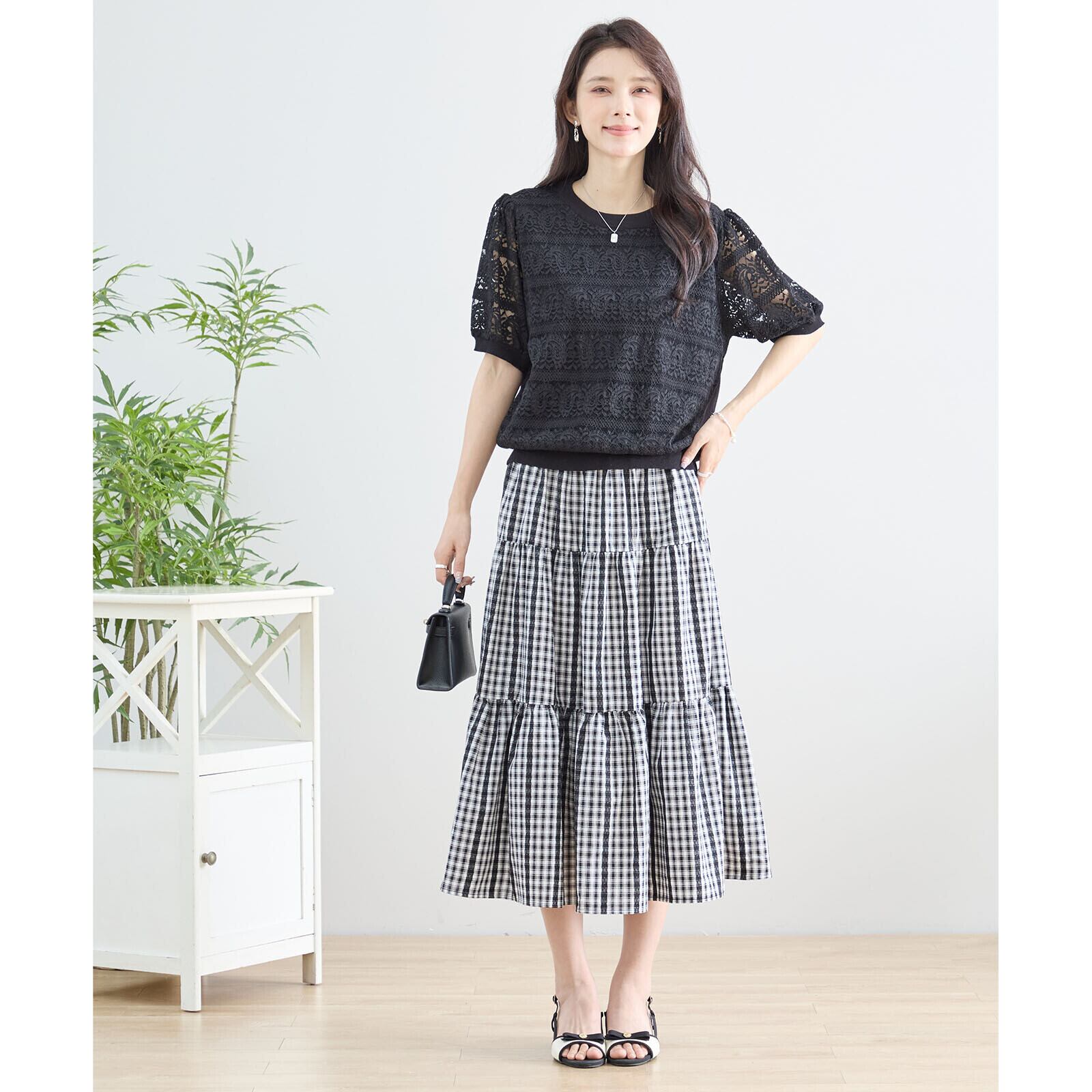 キーワード:#ティアードスカート #ギンガムチェック #レースライン #カジュアル #お出かけ #エレガント #プチプラ #M~Lサイズ