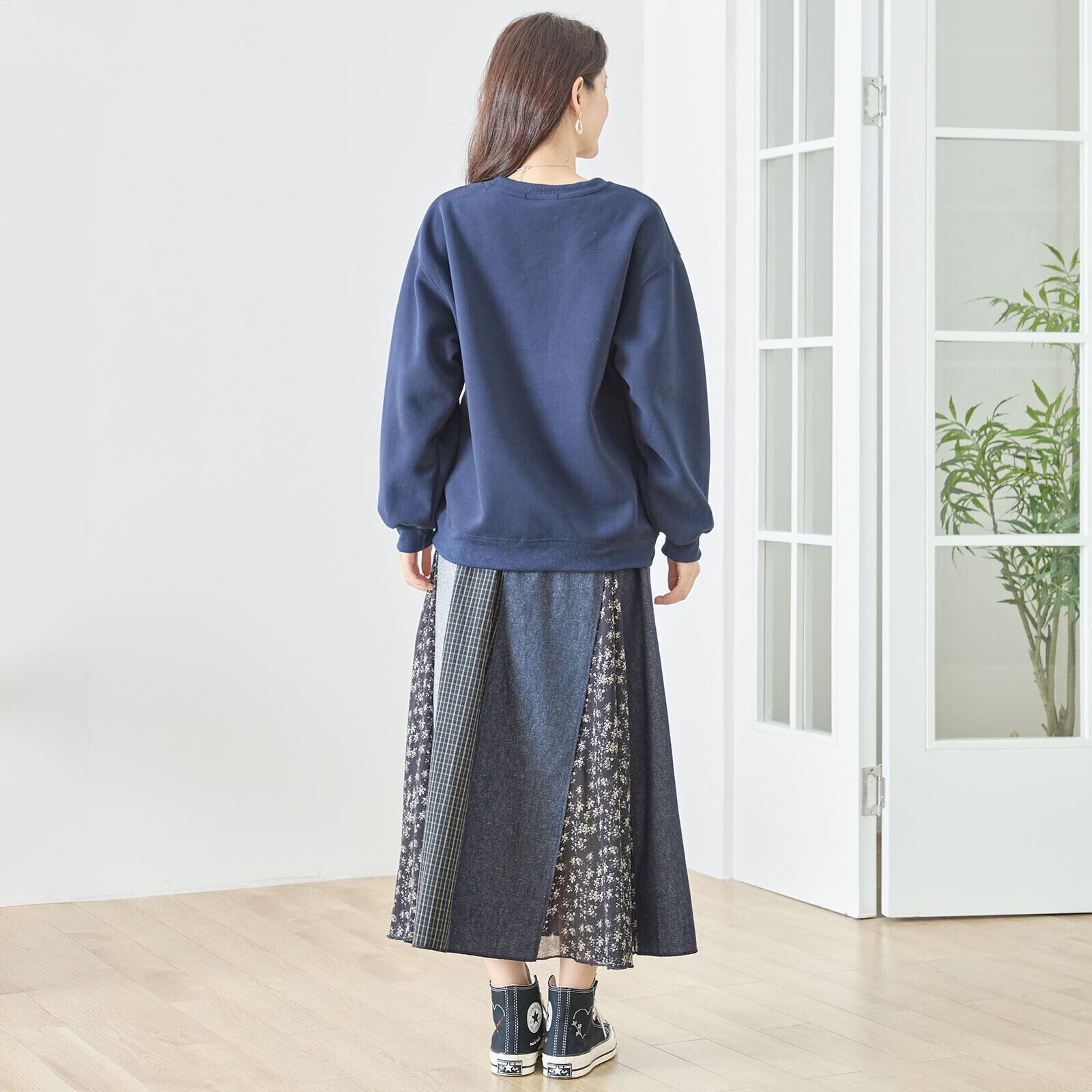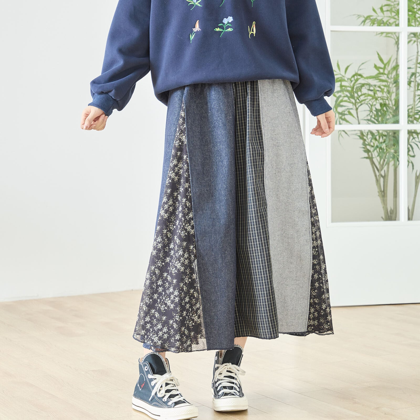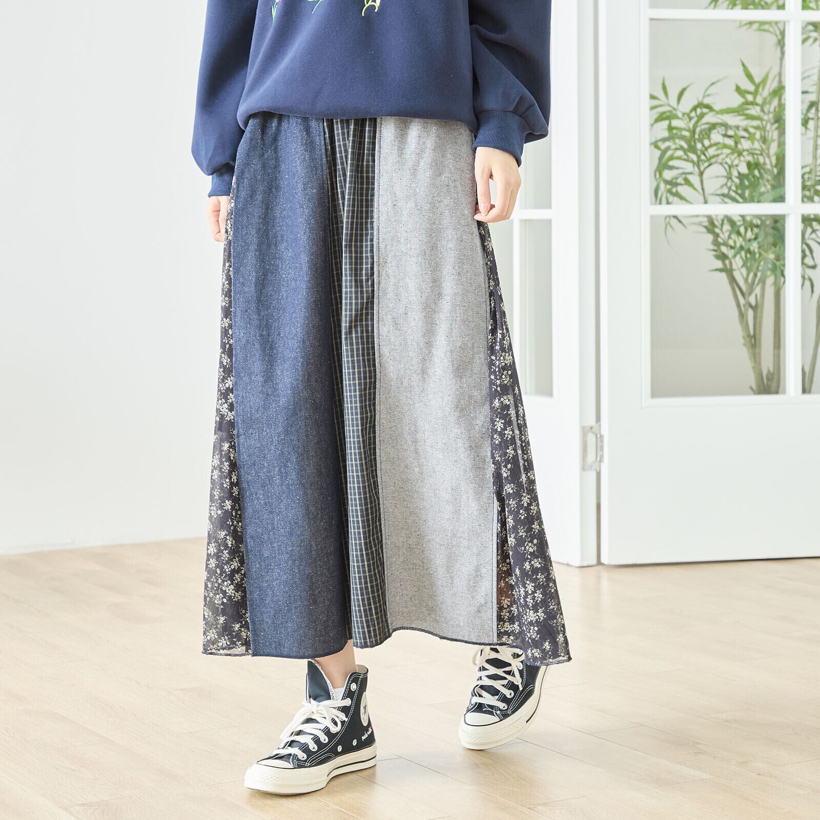 小花柄シフォンを組み合わせたパッチワークデザインのロングスカート。