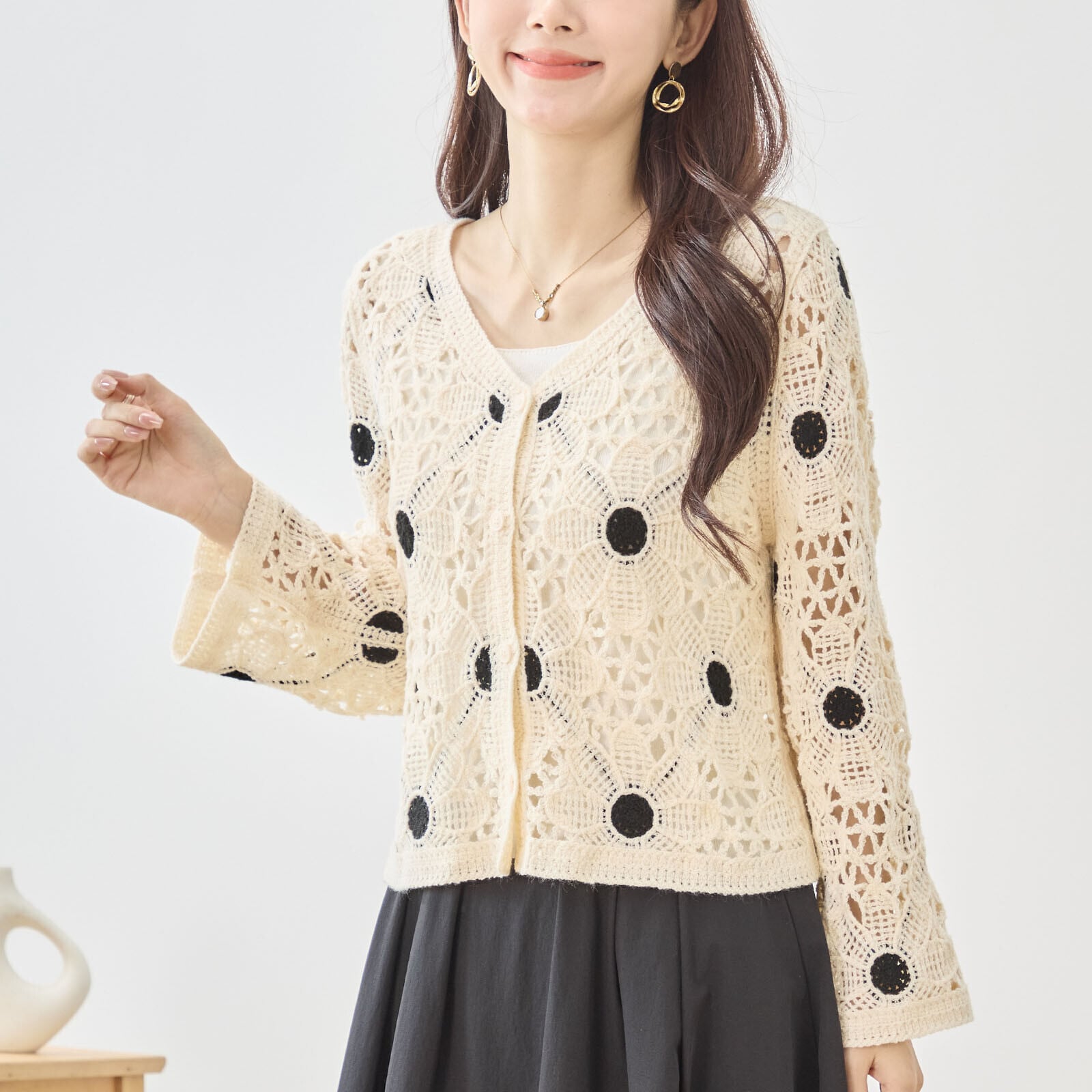 配色ドットが印象的なニットカーディガン。
