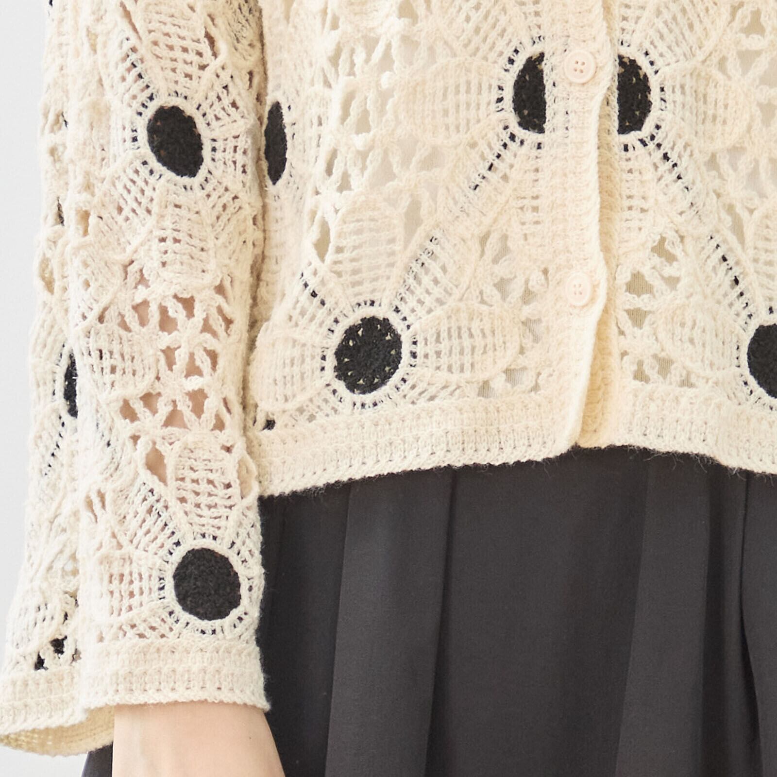レース編みと配色ドットの魅力的なデザインが印象的で、