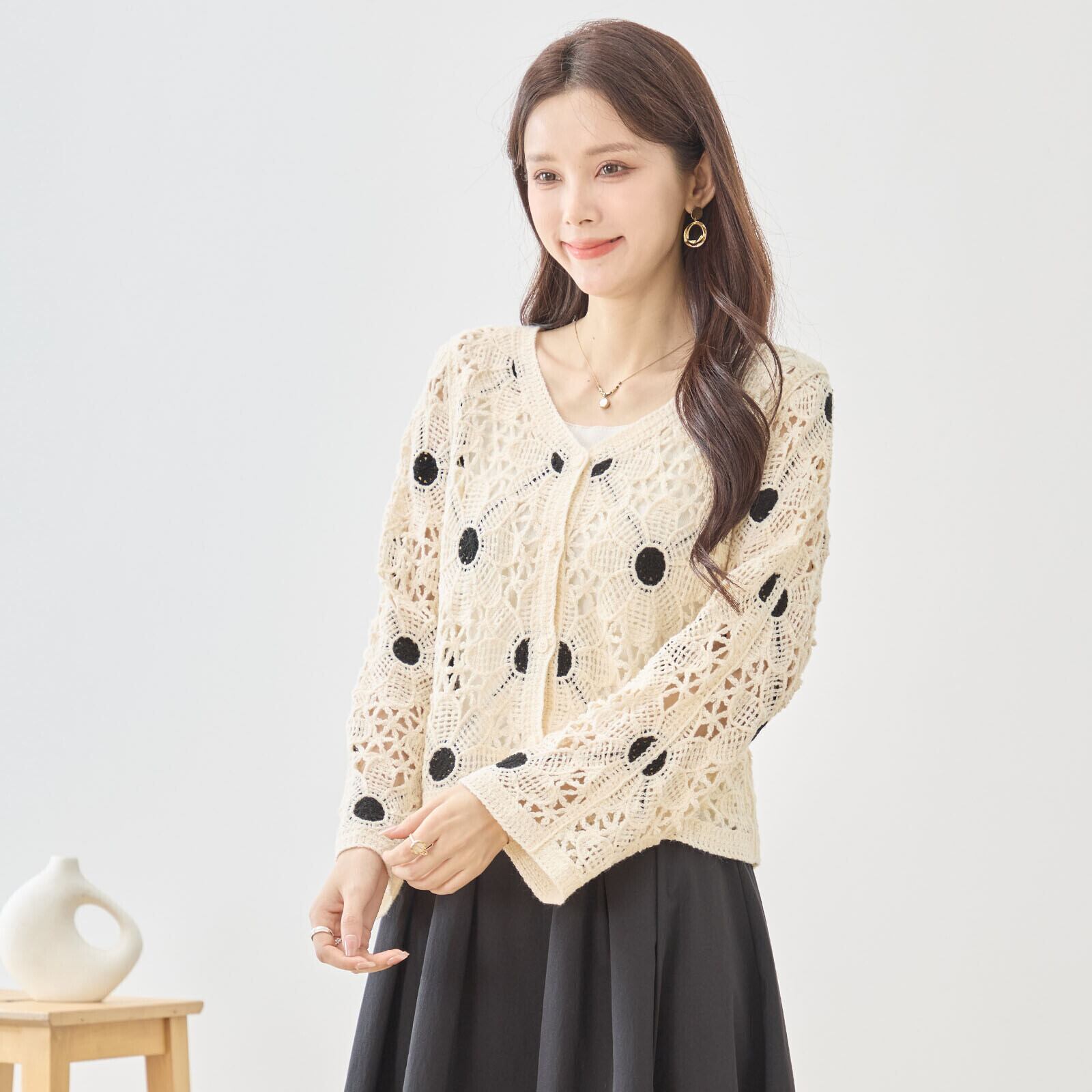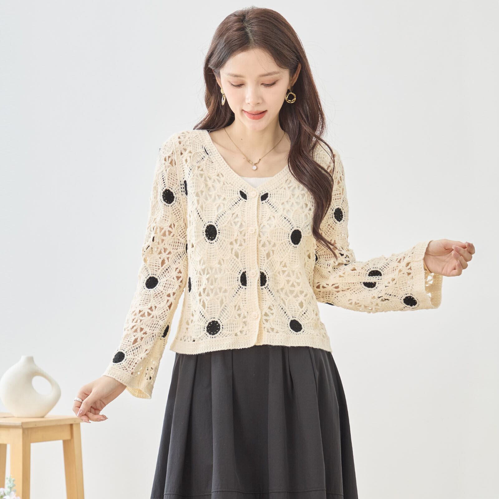 キーワード:#ニットカーディガン #レトロ #レース編み #ベージュ #おしゃれ #デイリーユース #特別な日 #Vネック