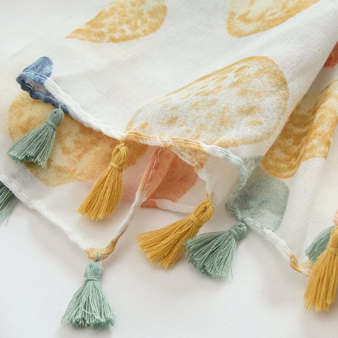 キーワード:#ストール #タッセル #プリント #アイボリー #おしゃれ #デイリーユース #特別な日 #持ち運び便利