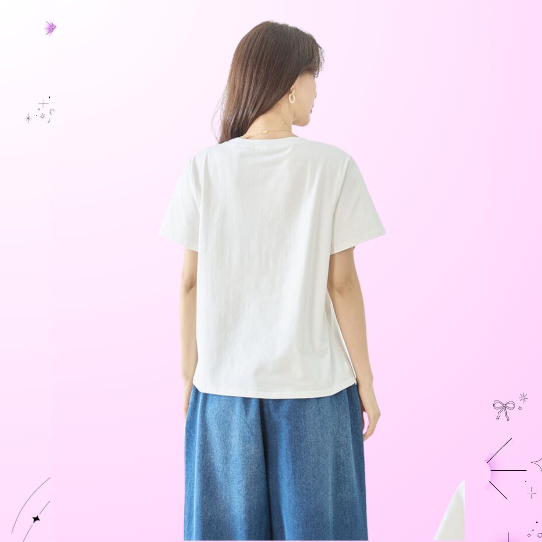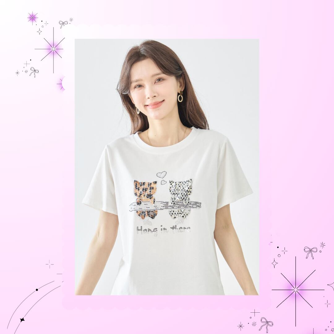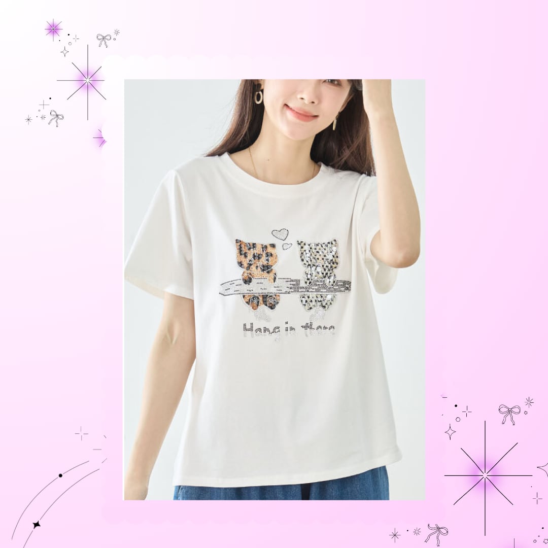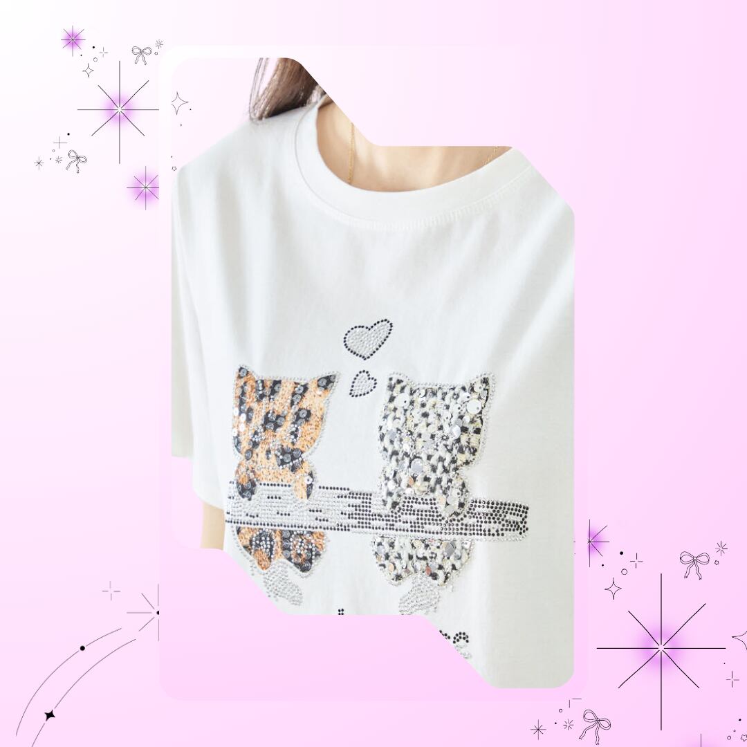 人気の白地に、スパンコールやラインストーンをあしらった華やかなデザインが印象的で、二匹の仔猫の間に浮かぶハートマークがキュートなアクセント。M~Lのサイズ感で、適度なゆとりがあり、快適な着心地を提供します。