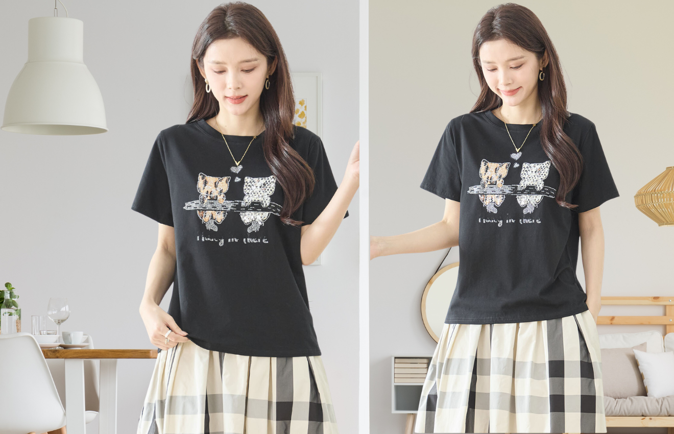 人気の黒地に、スパンコールやラインストーンをあしらった華やかなデザインが印象的で、二匹の仔猫の間に浮かぶハートマークがキュートなアクセント。M~Lのサイズ感で、適度なゆとりがあり、快適な着心地を提供します。