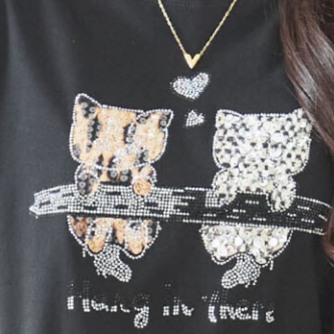 キーワード:#Tシャツ #猫 #スパンコール #ブラック #おしゃれ #デイリーユース #カジュアル #可愛い