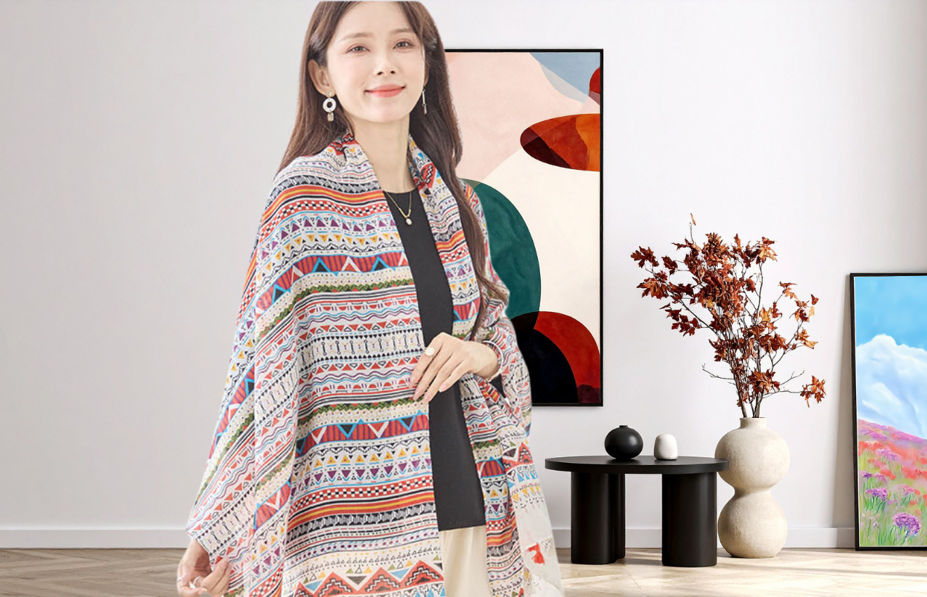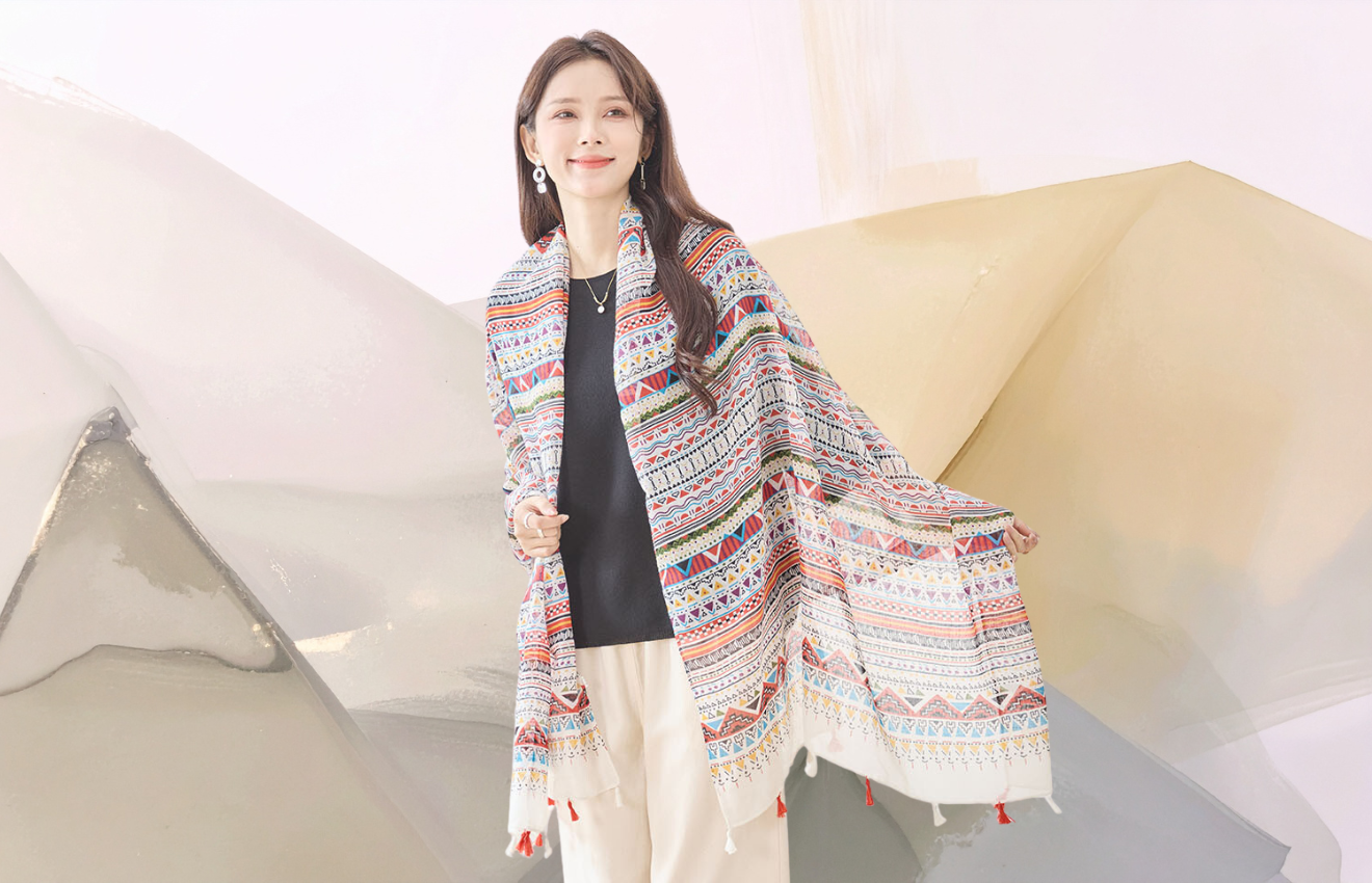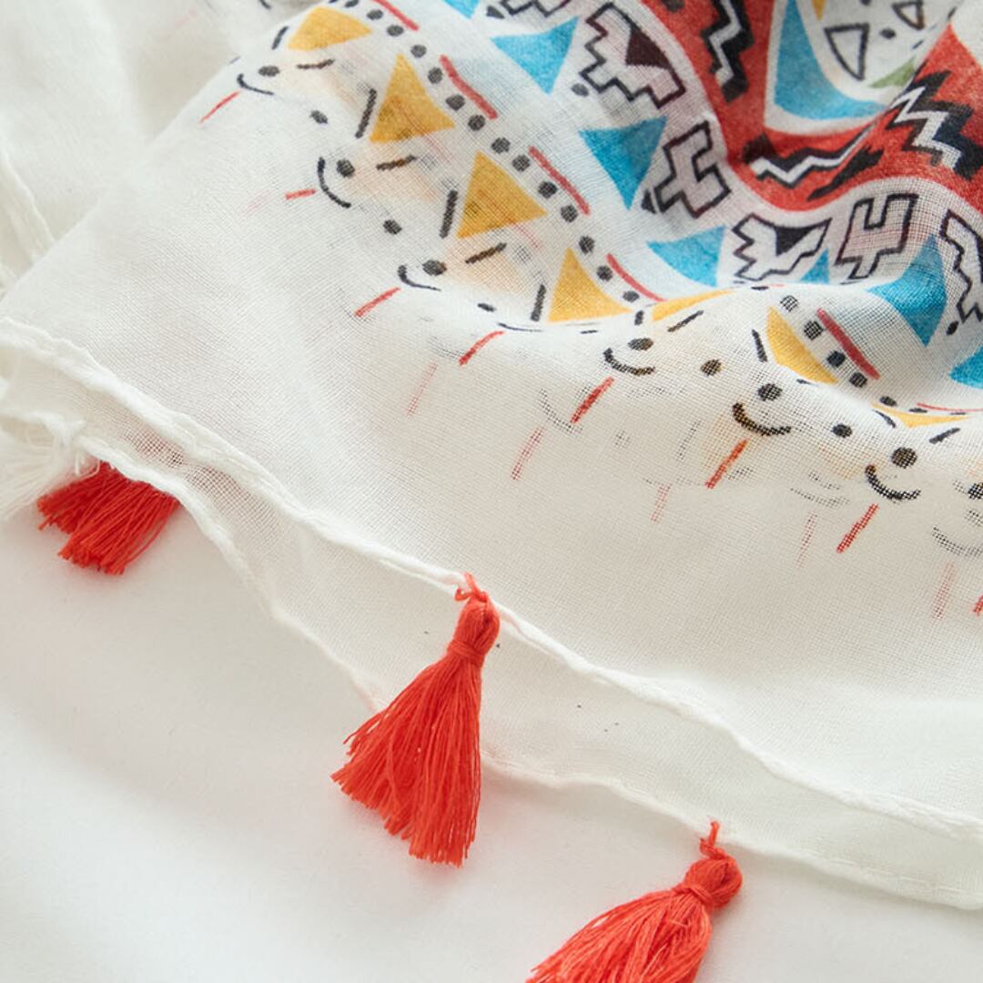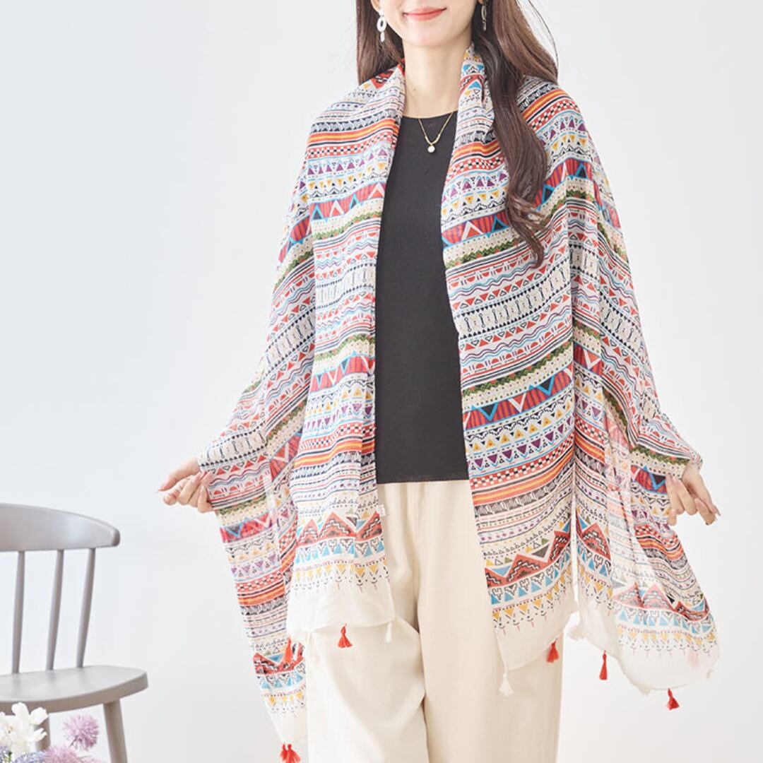 キーワード:#ストール #タッセル #プリント #アイボリー #おしゃれ #デイリーユース #特別な日 #持ち運び便利
