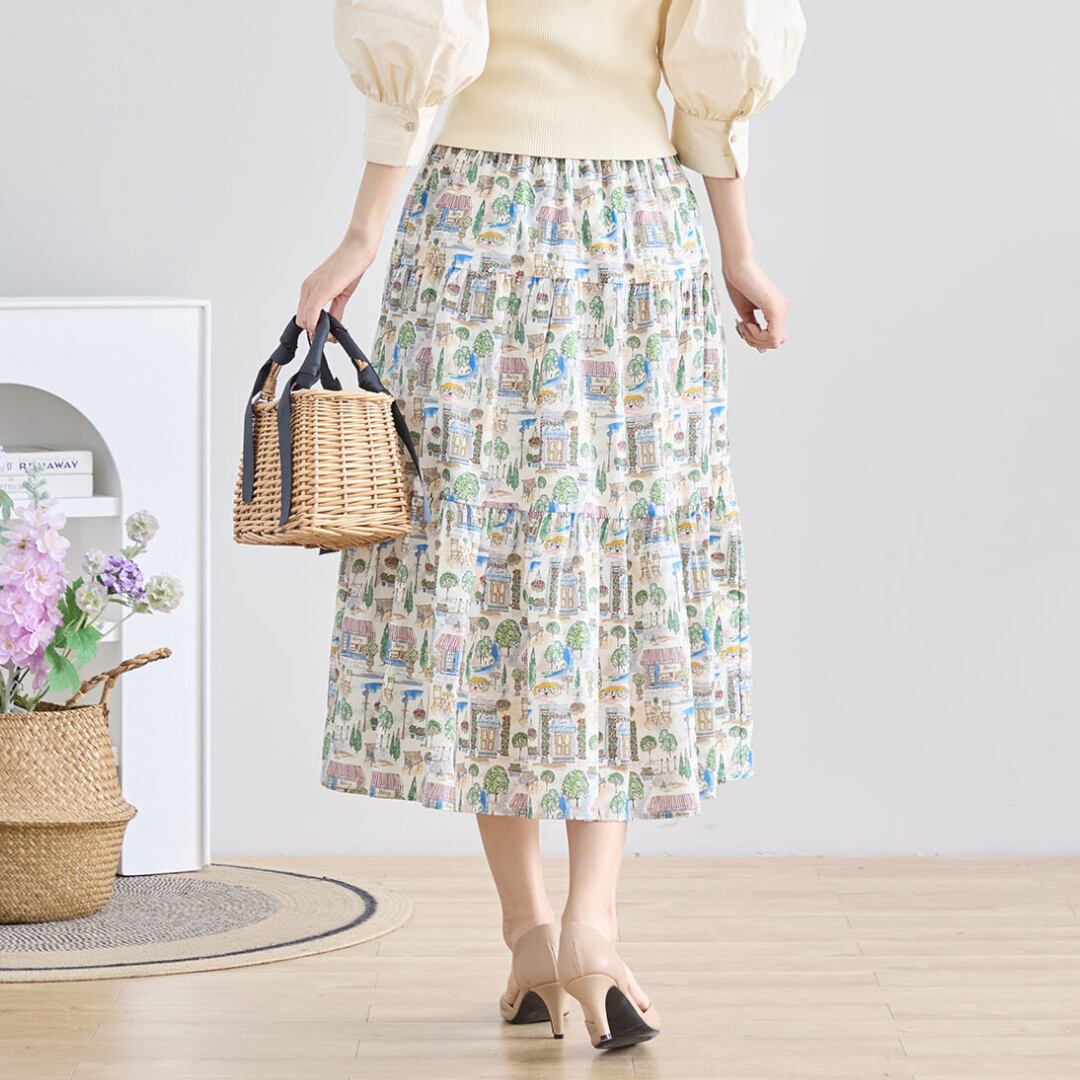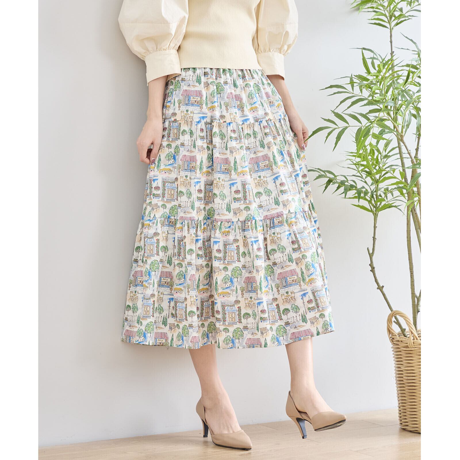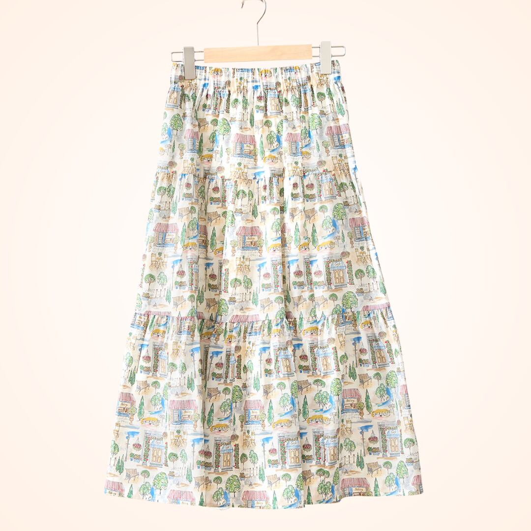 大人の遊び心をくすぐる、TRUBE フレンチヴィンテージプリントスカート【M~L】ベージュが登場です。街角のカフェや緑あふれる公園、かわいらしい建物が描かれたアートのようなデザインが、見る人を魅了します。