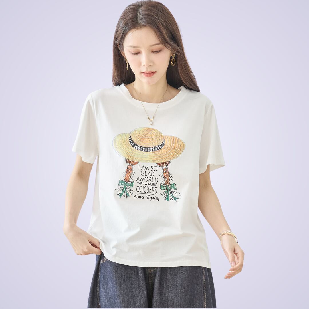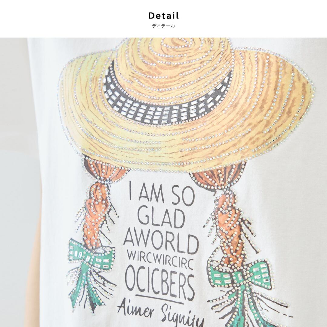 ナチュラルでレトロな雰囲気が魅力的な、ストローハットガールプリントTシャツが登場です。ラインストーン付きの麦わら帽子をかぶった三つ編みの女の子が描かれた可愛らしいプリントが、さりげなくあなたのスタイルにポイントを添えてくれます。
