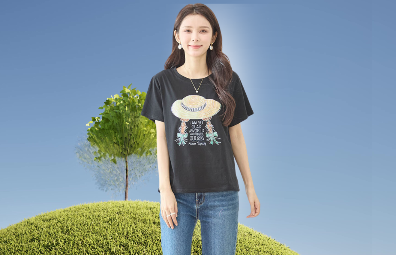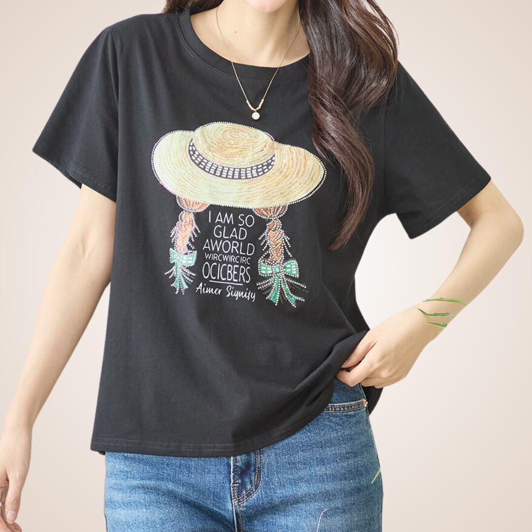 ナチュラルでレトロな雰囲気が魅力的な、ストローハットガールプリントTシャツが登場です。ラインストーン付きの麦わら帽子をかぶった三つ編みの女の子が描かれた可愛らしいプリントが、さりげなくあなたのスタイルにポイントを添えてくれます。