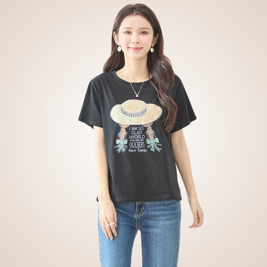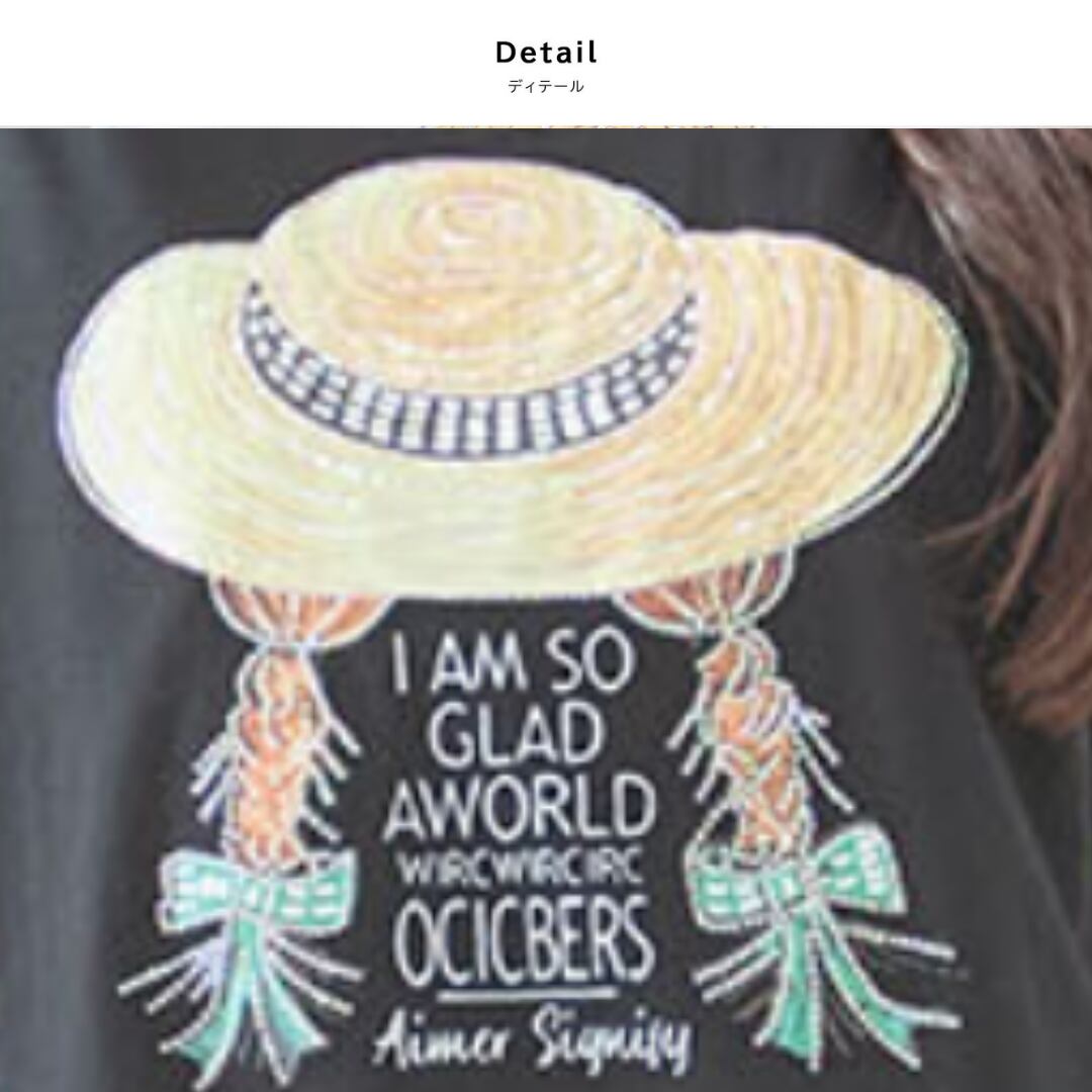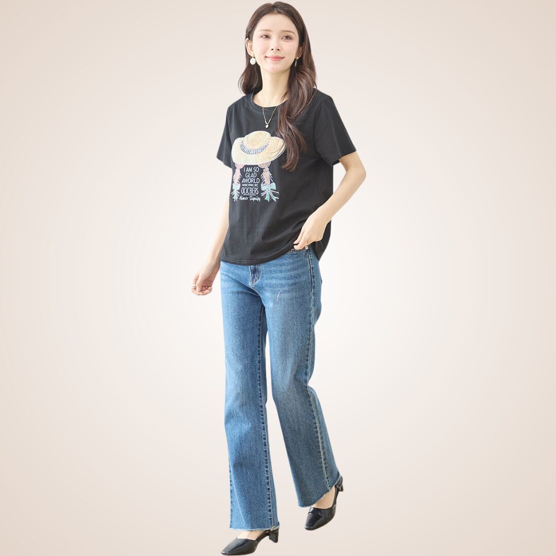 キーワード:#Tシャツ #ブラック #レトロ #ストローハット #女性らしさ #カジュアル #コーディネート #プリント