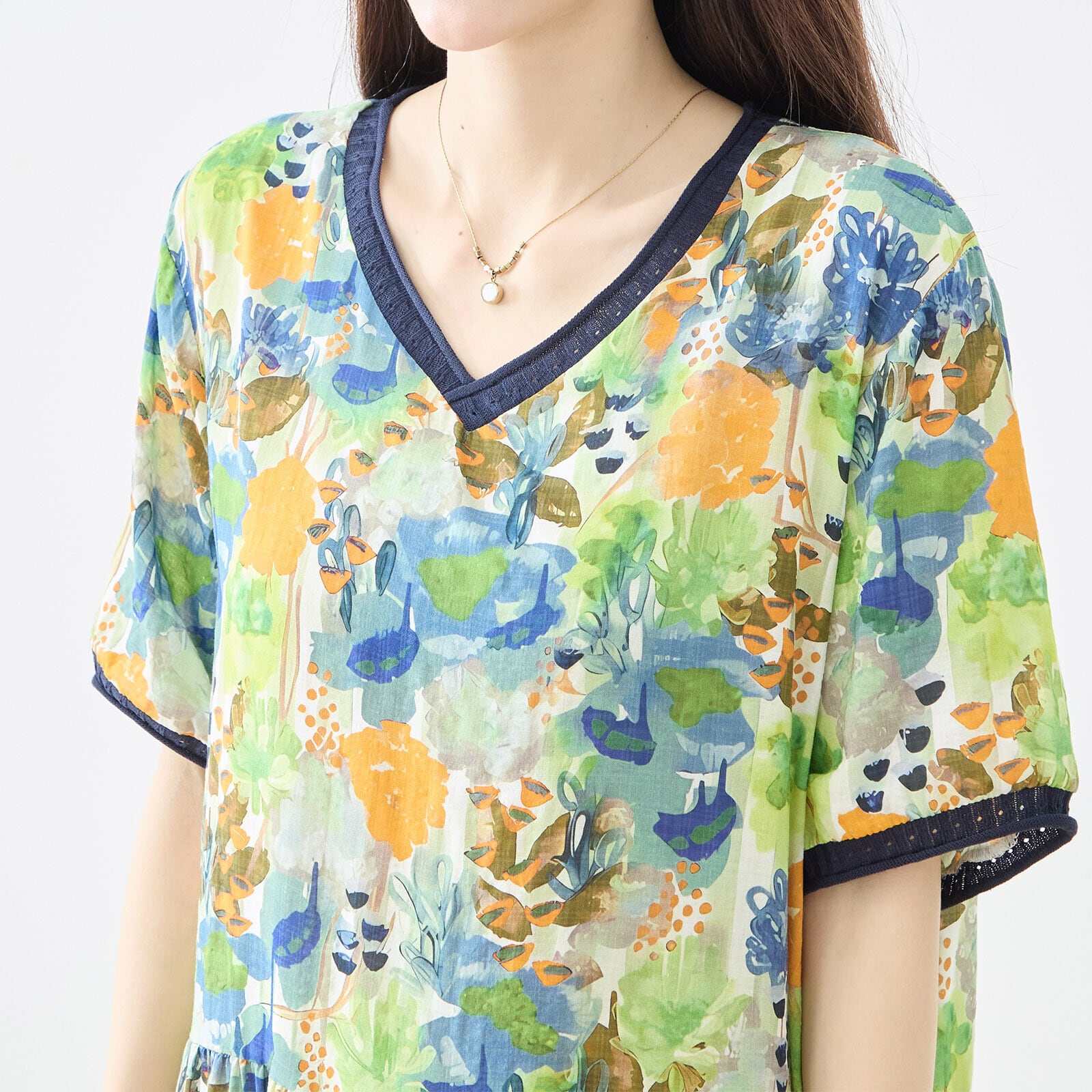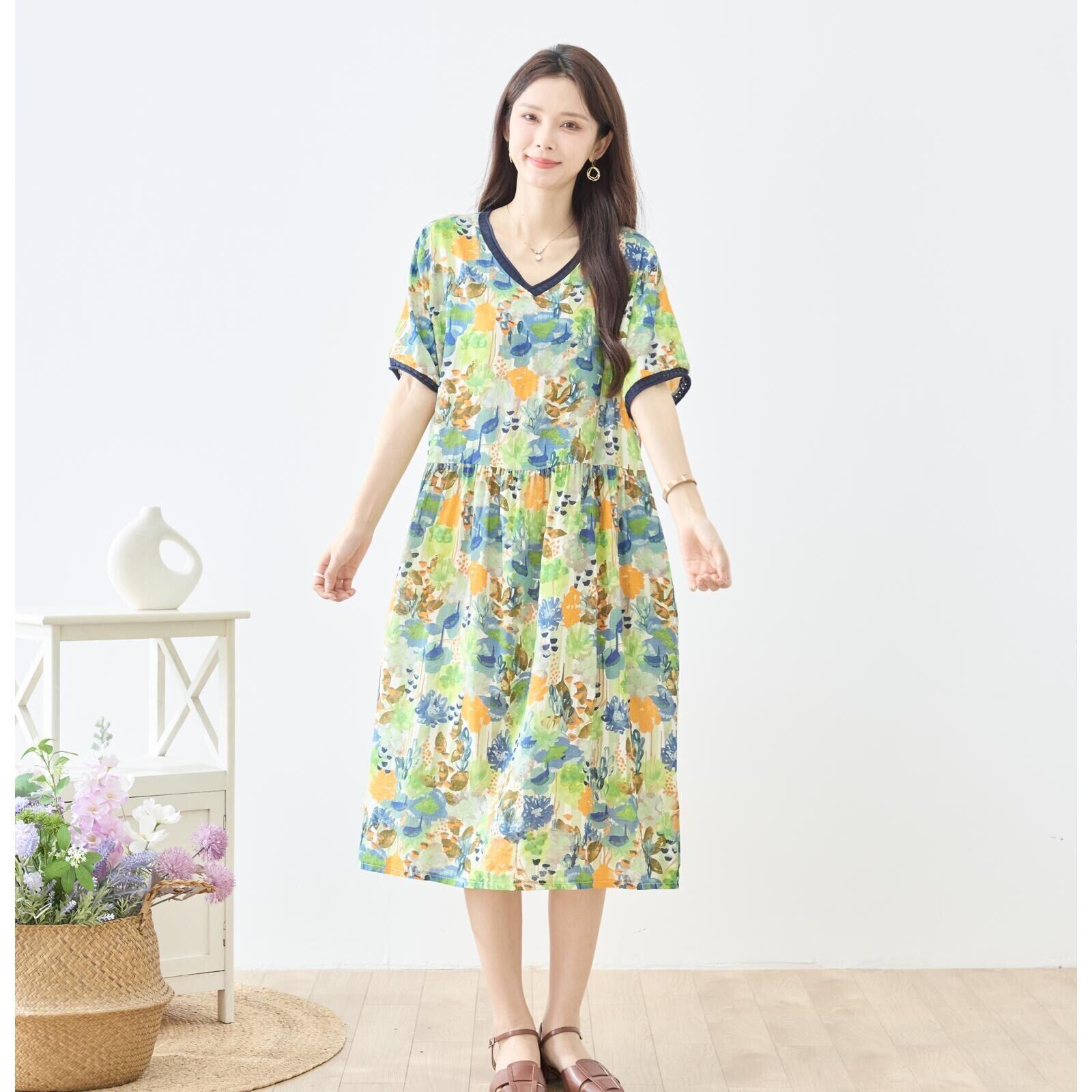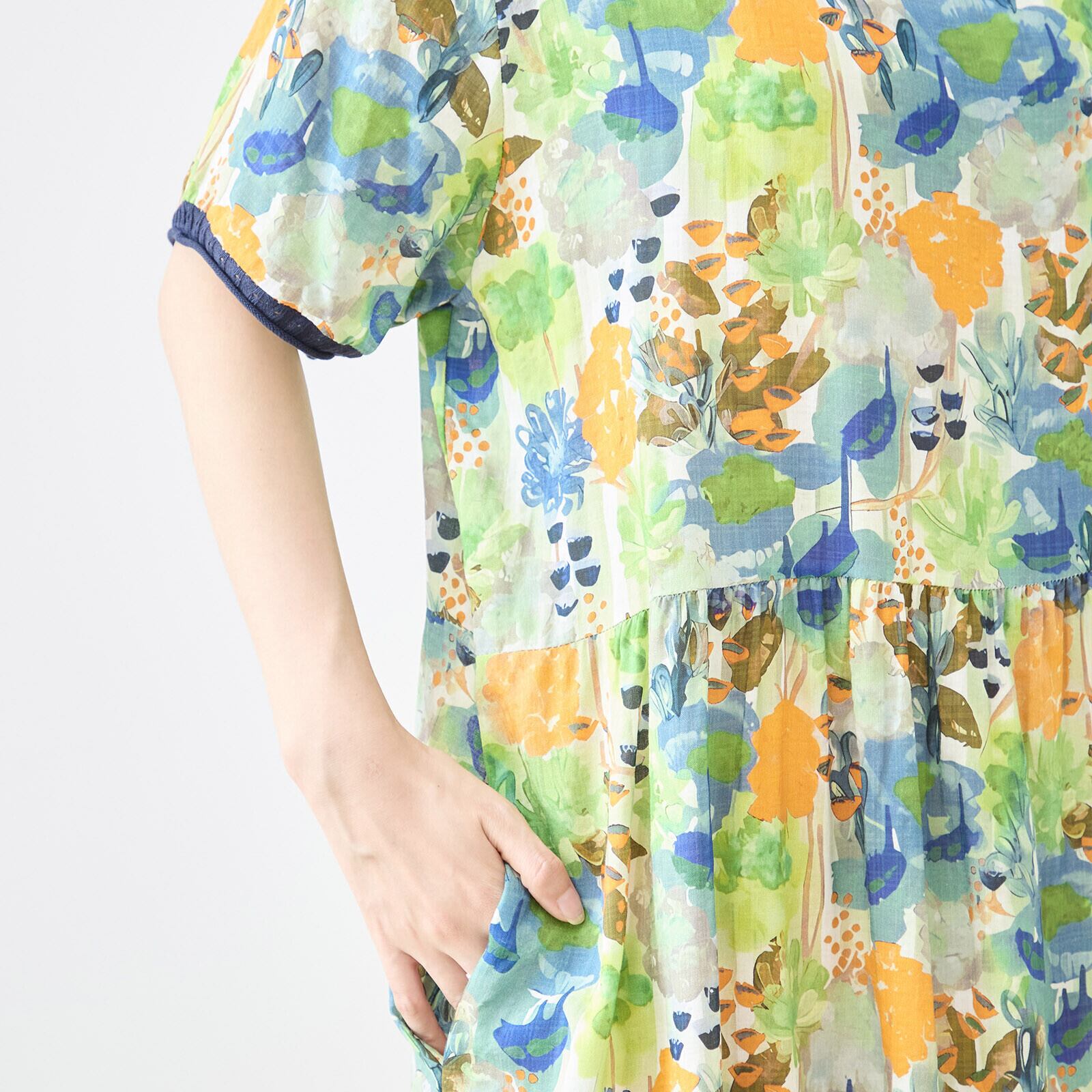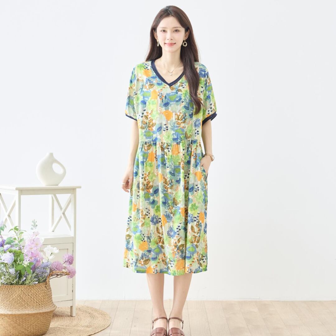 キーワード:#ワンピース #水彩フラワー #ブルー #グリーン #Vネック #リラックス #フェミニン #コーディネート