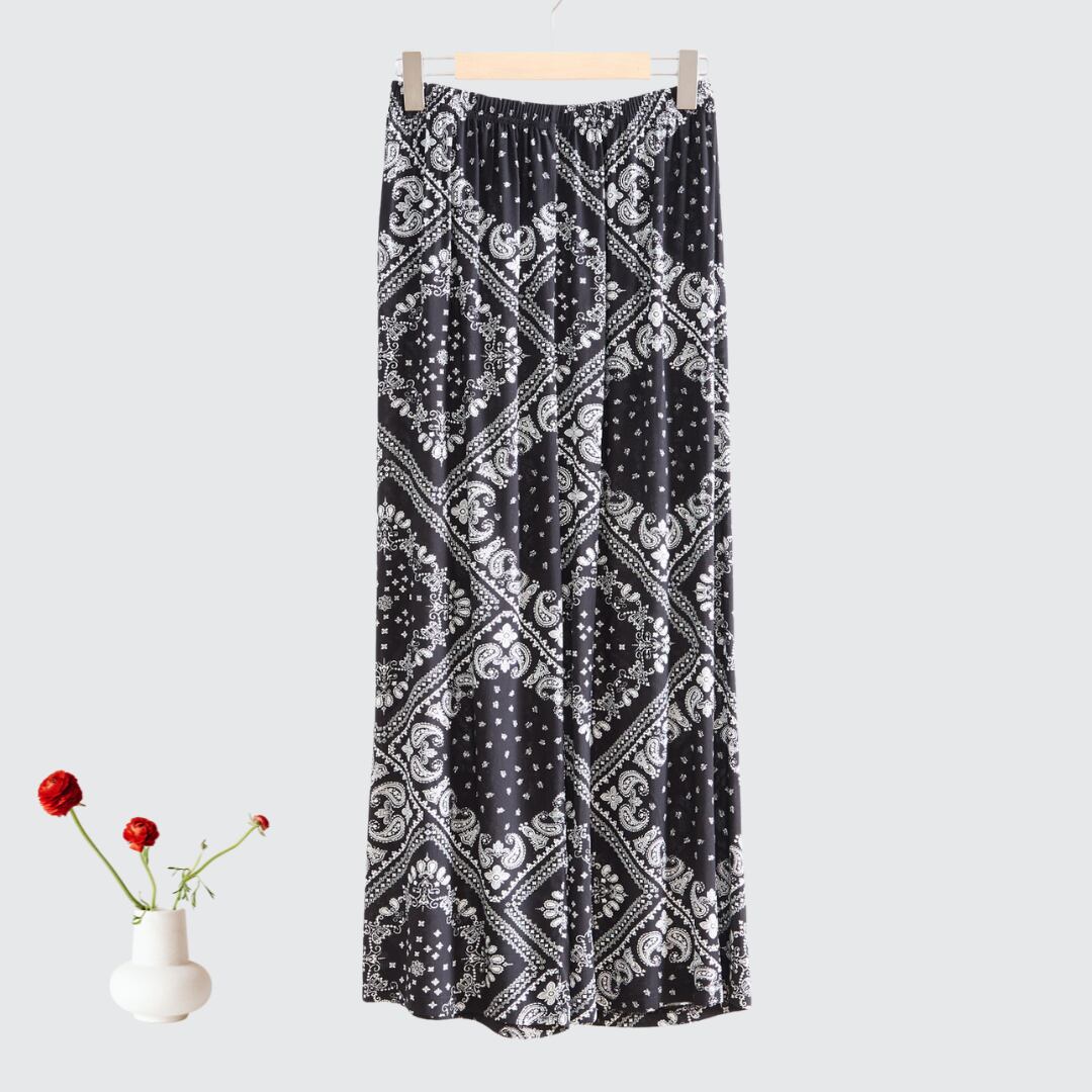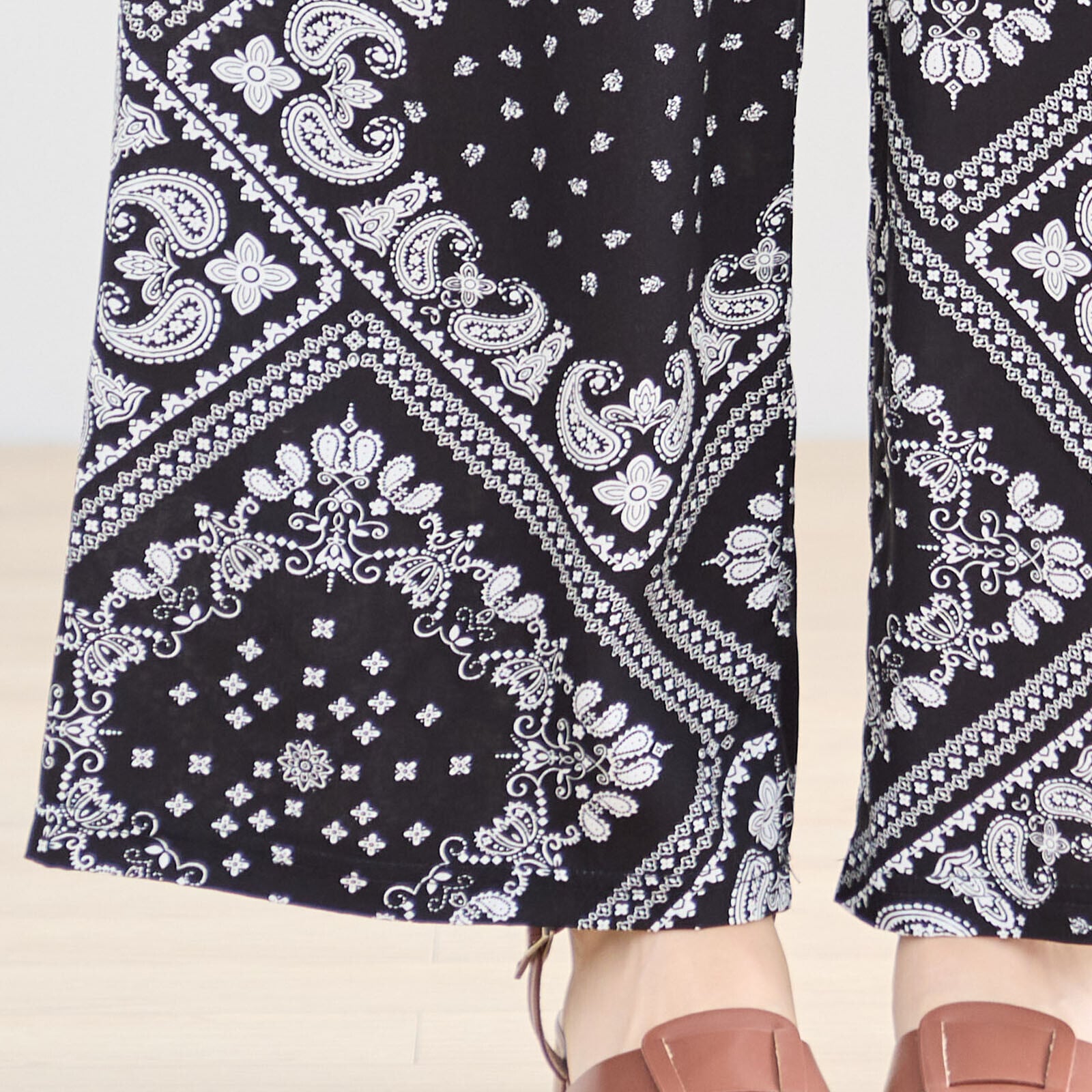 バンダナ風ペイズリープリントが目を引く、TRUBEのバンダナ風プリントワイドリラックスパンツ【M~L】ブラックが新登場!カジュアルでありながらモードな雰囲気を醸し出すデザインが特徴です。