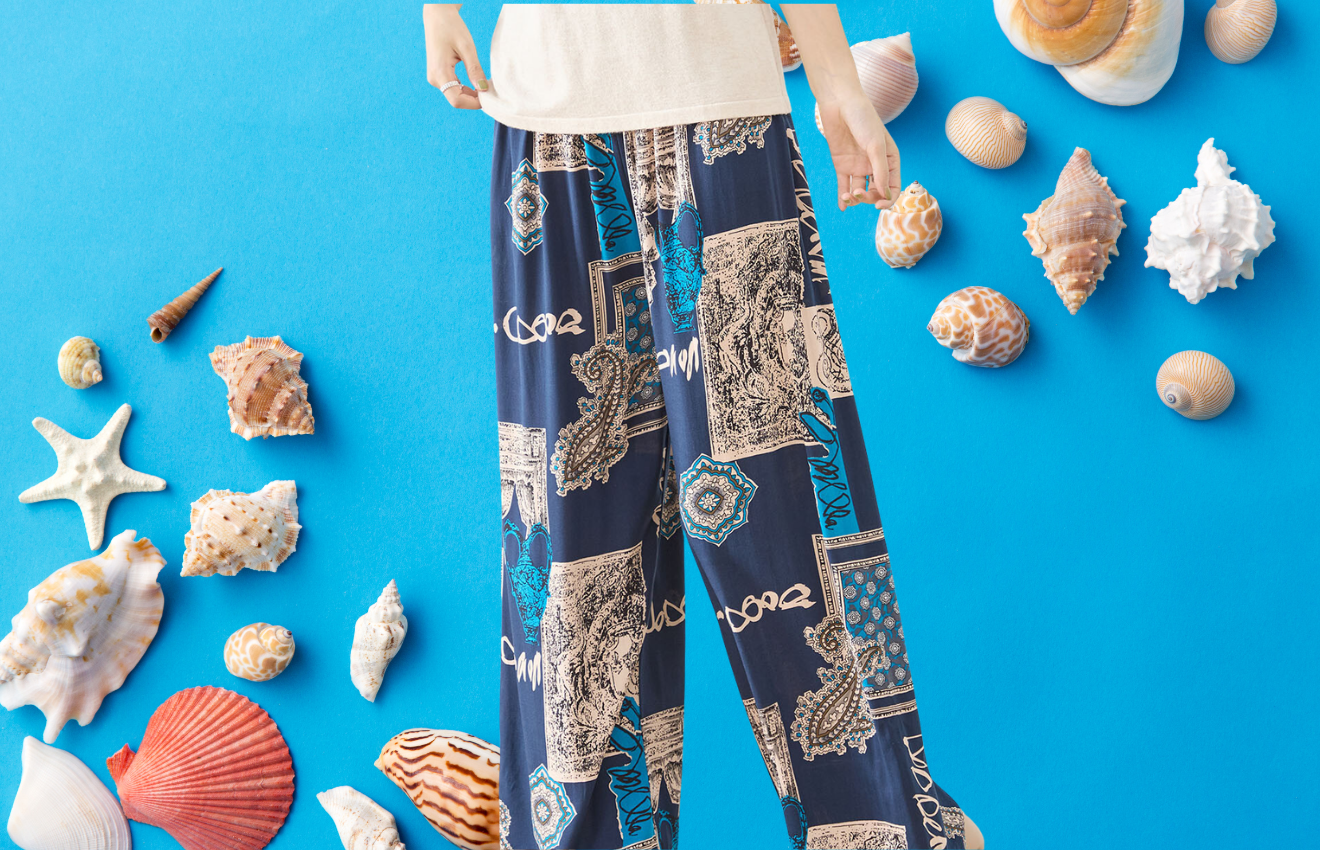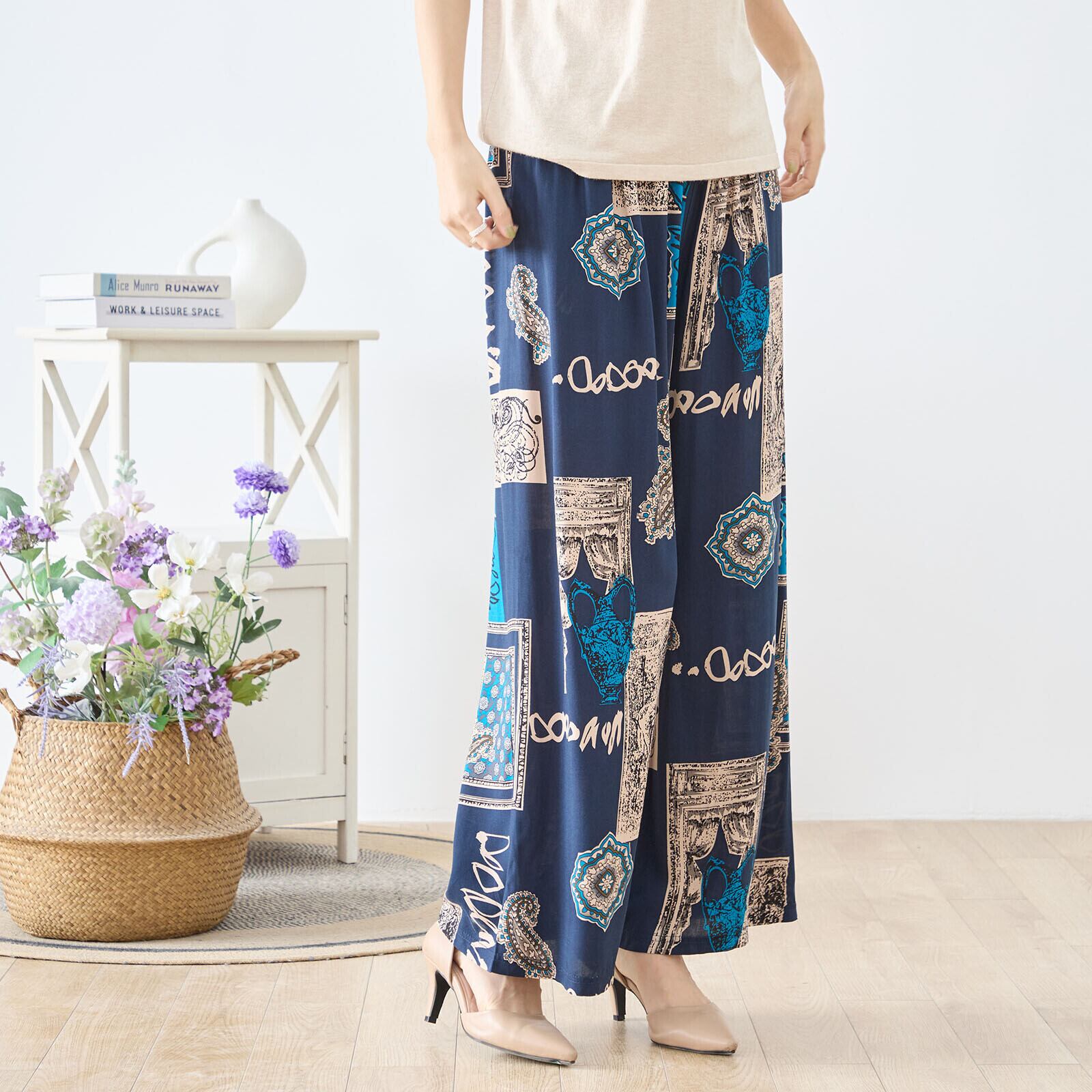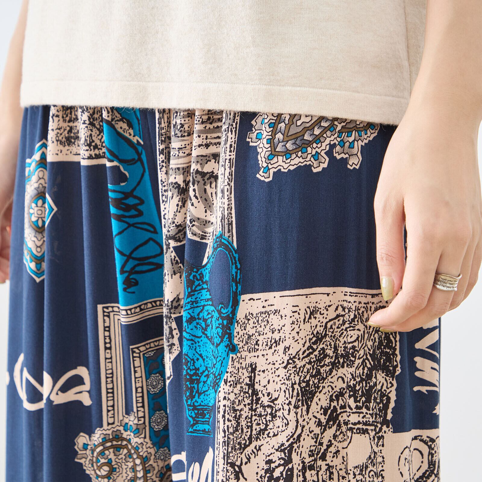 アートポスターを思わせるプリントが印象的なリラックスワイドパンツ。