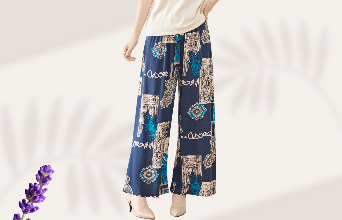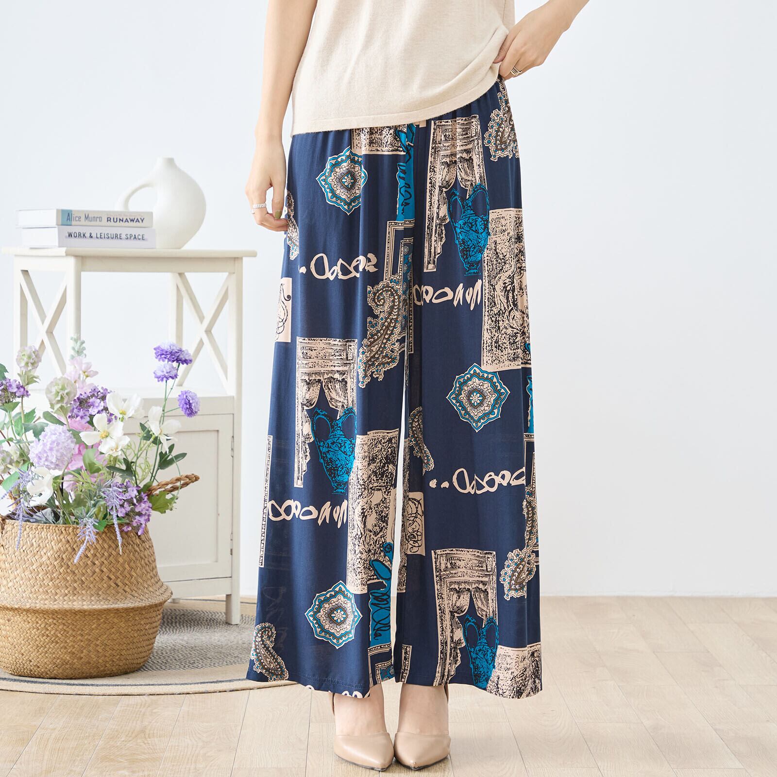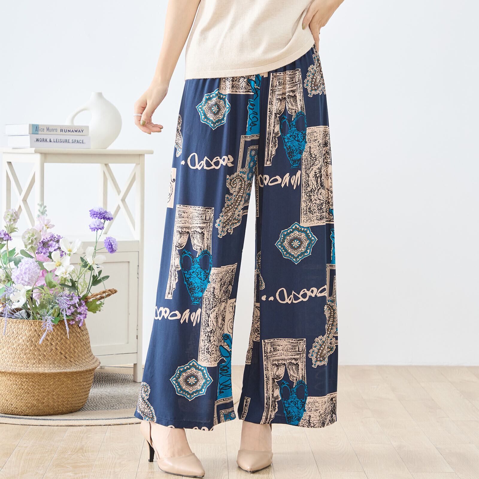 アートポスターを思わせるプリントが印象的なリラックスワイドパンツ。