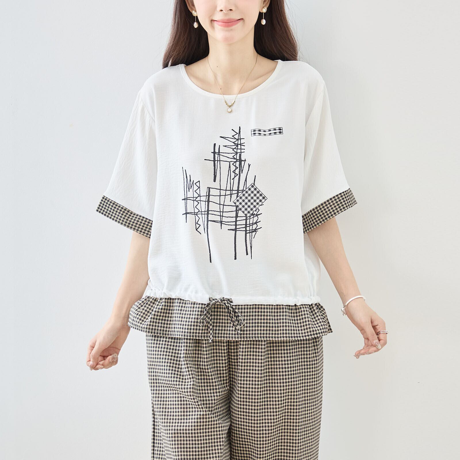 キーワード:#セットアップ #ホワイト #ギンガムチェック #ラインアート #リラクシング #カジュアル #春夏